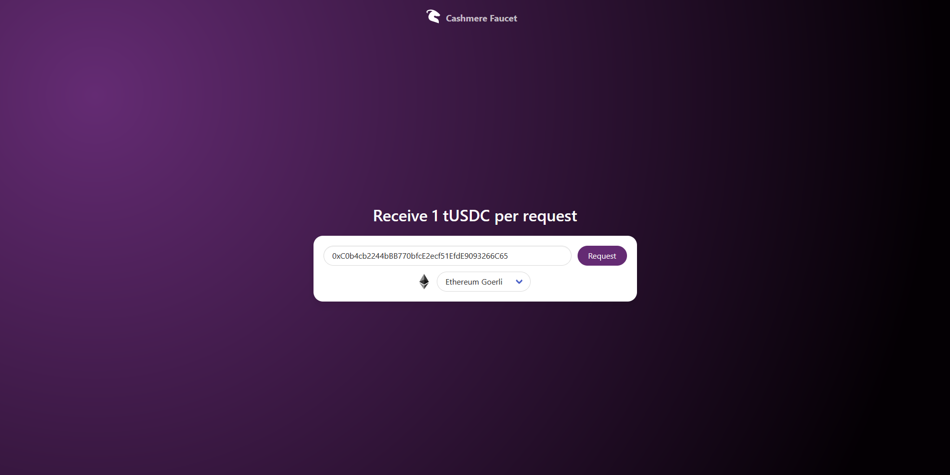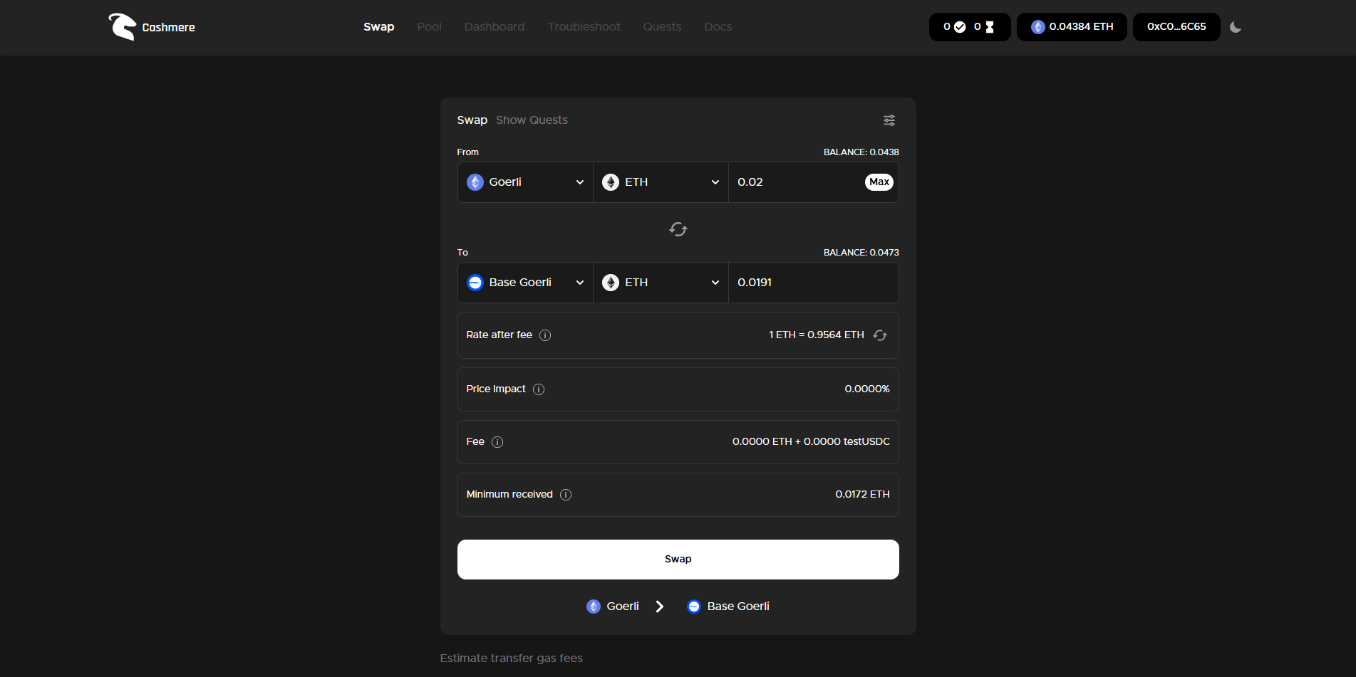 Next, we need to claim some test tokens, choose the "Cashmere Faucet" and request some Ethereum Goerli Now let's perform some swaps.