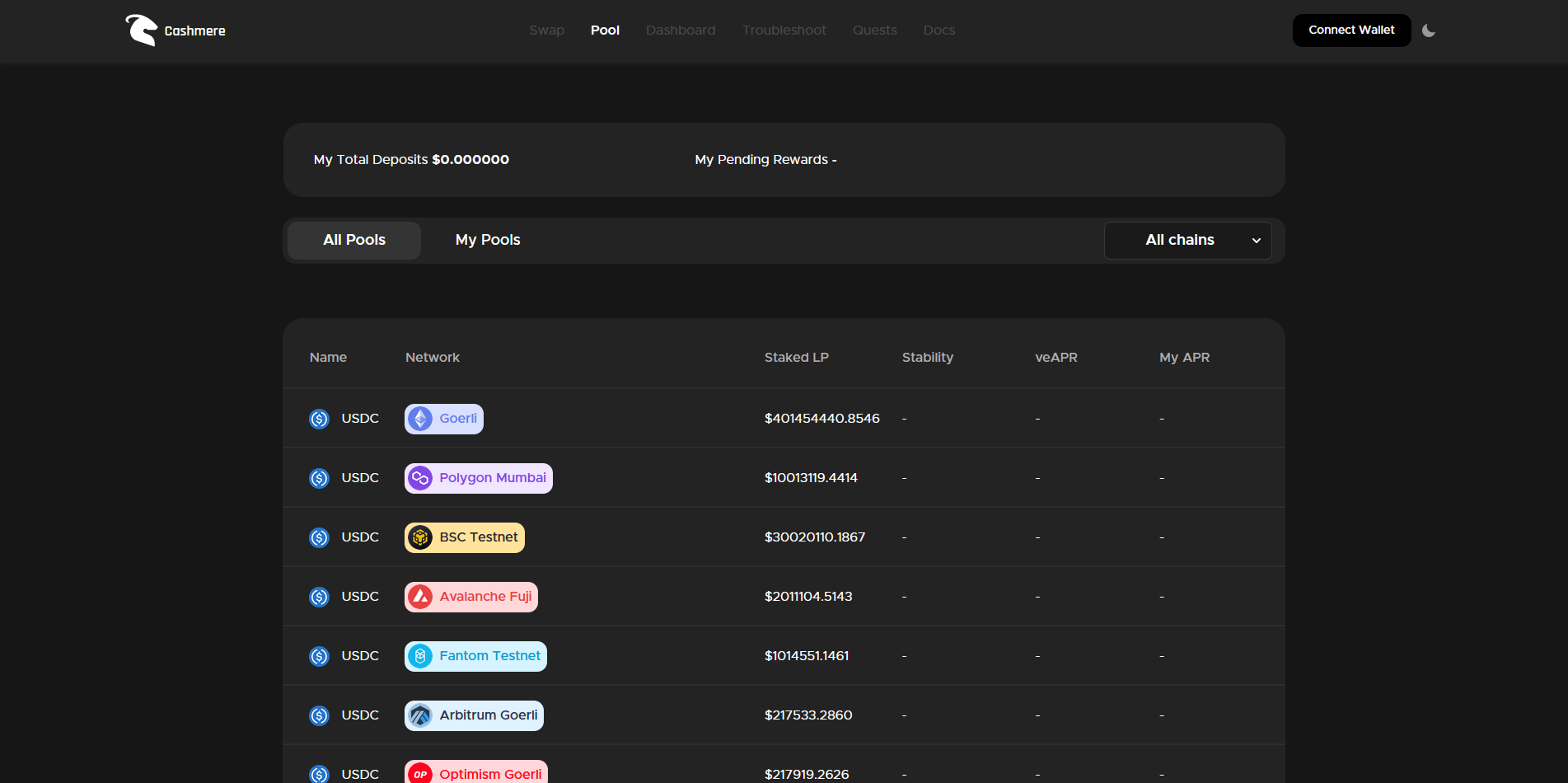 Head over to testnet.cashmere.exchange/pool and connect your wallet.