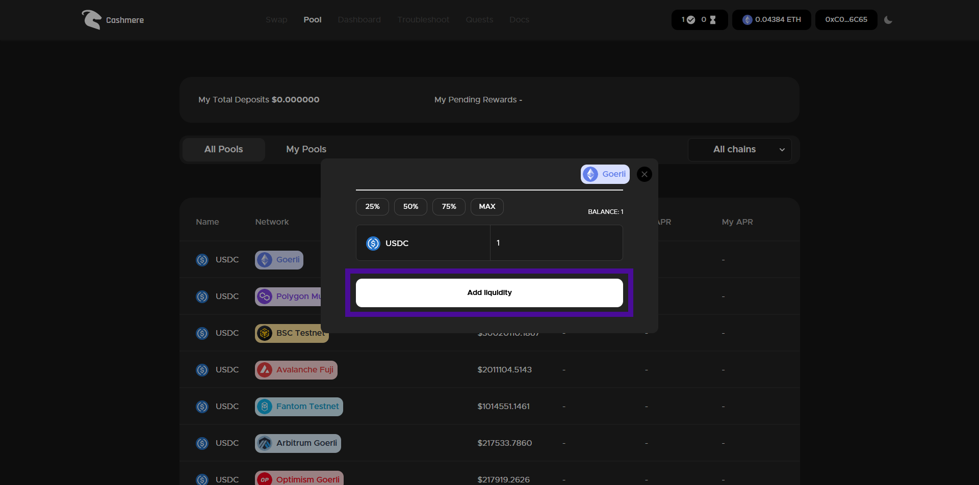 Select the "Goerli" pool, insert available amount of USDC and hit "Add liquidity".