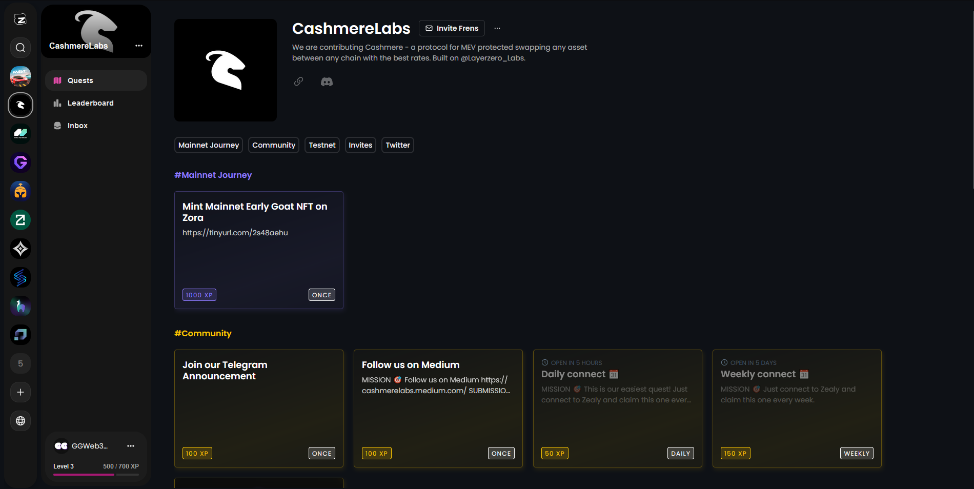 Now let's head over to the Zealy tasks: zealy.io/c/cashmerelabs