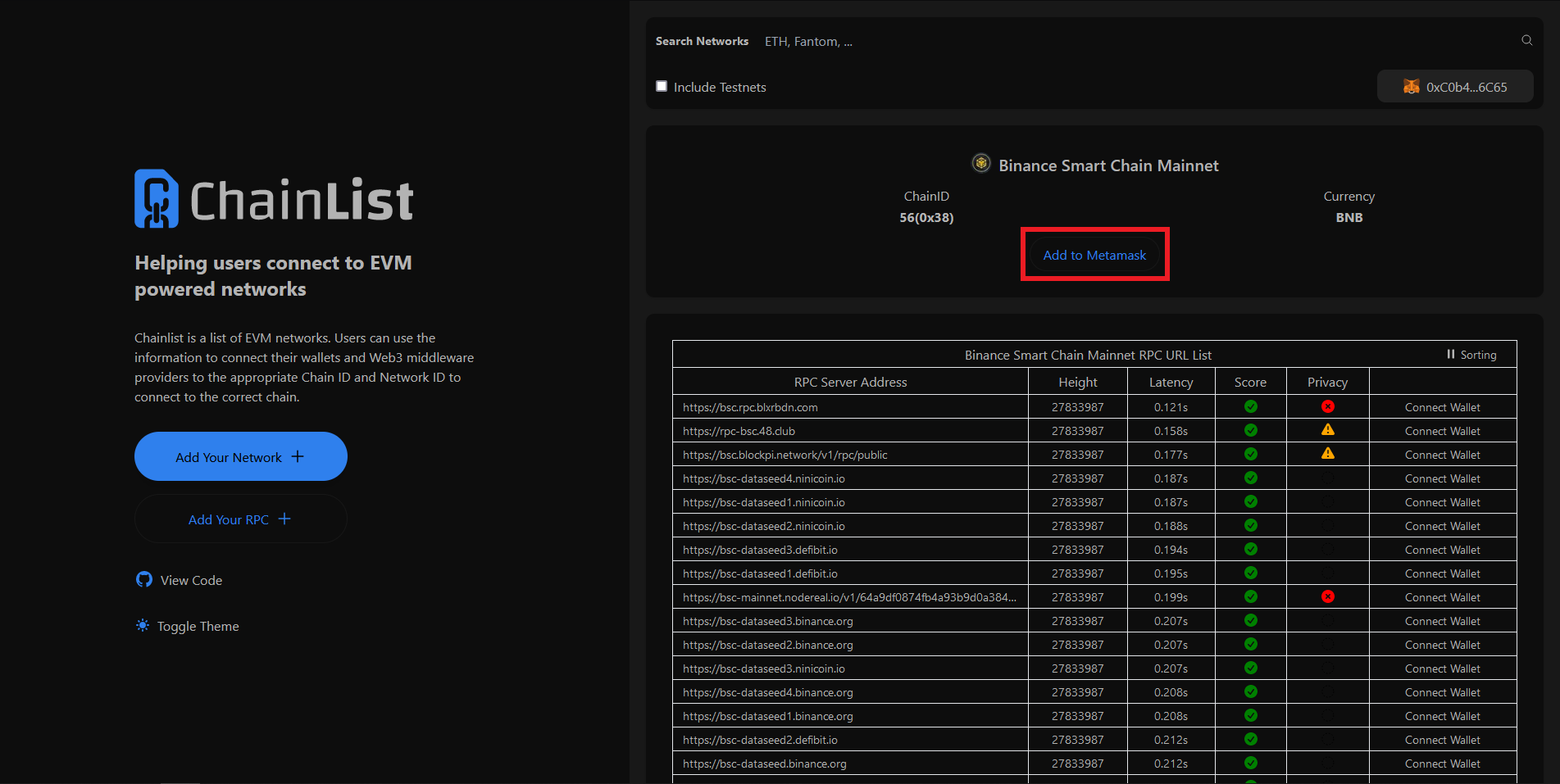 To do this, go to chainlist.org/chain/56 & select "Add to MetaMask".