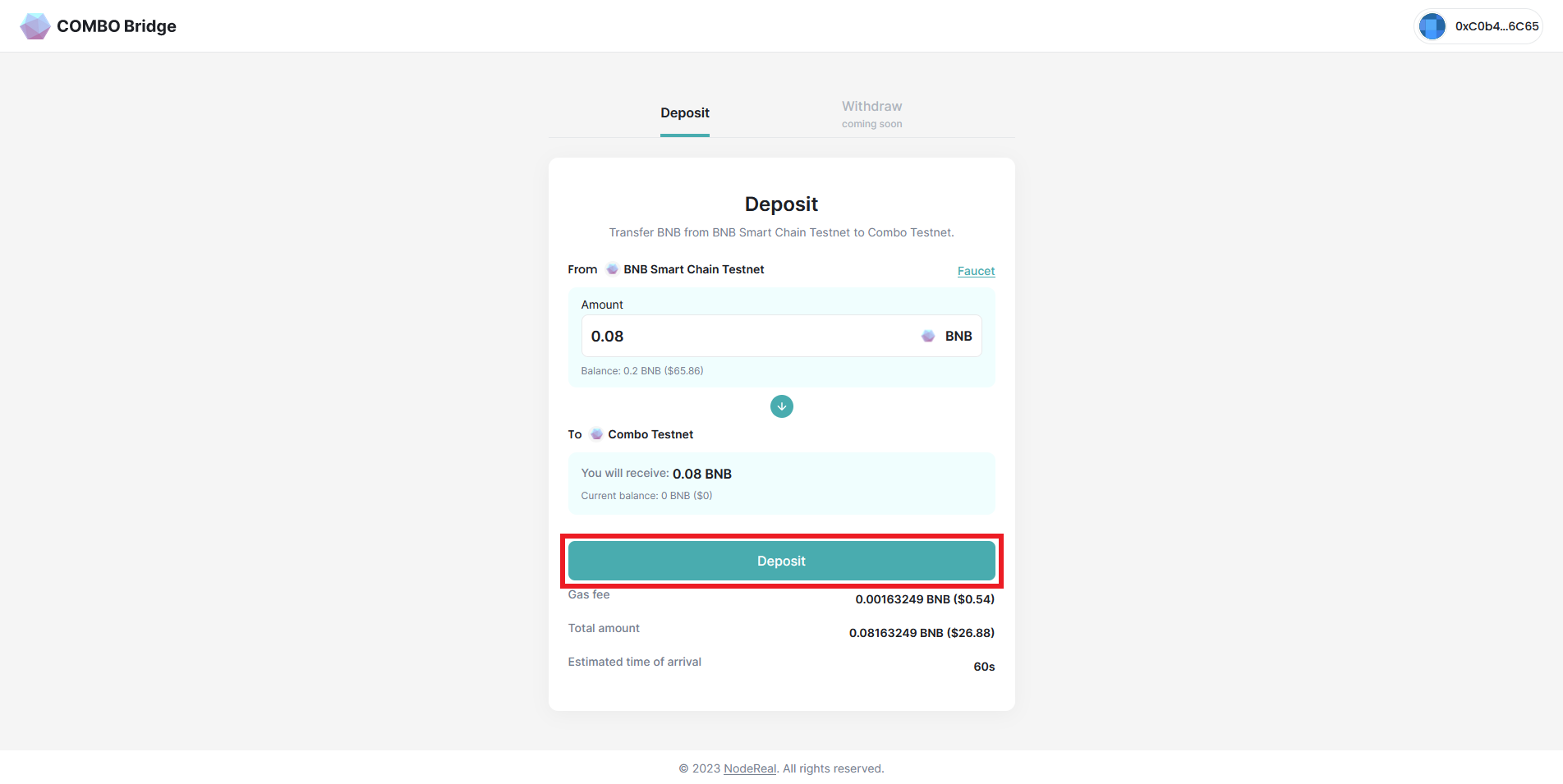 Now let's bridge some BNB test tokens to the Combo testnet!