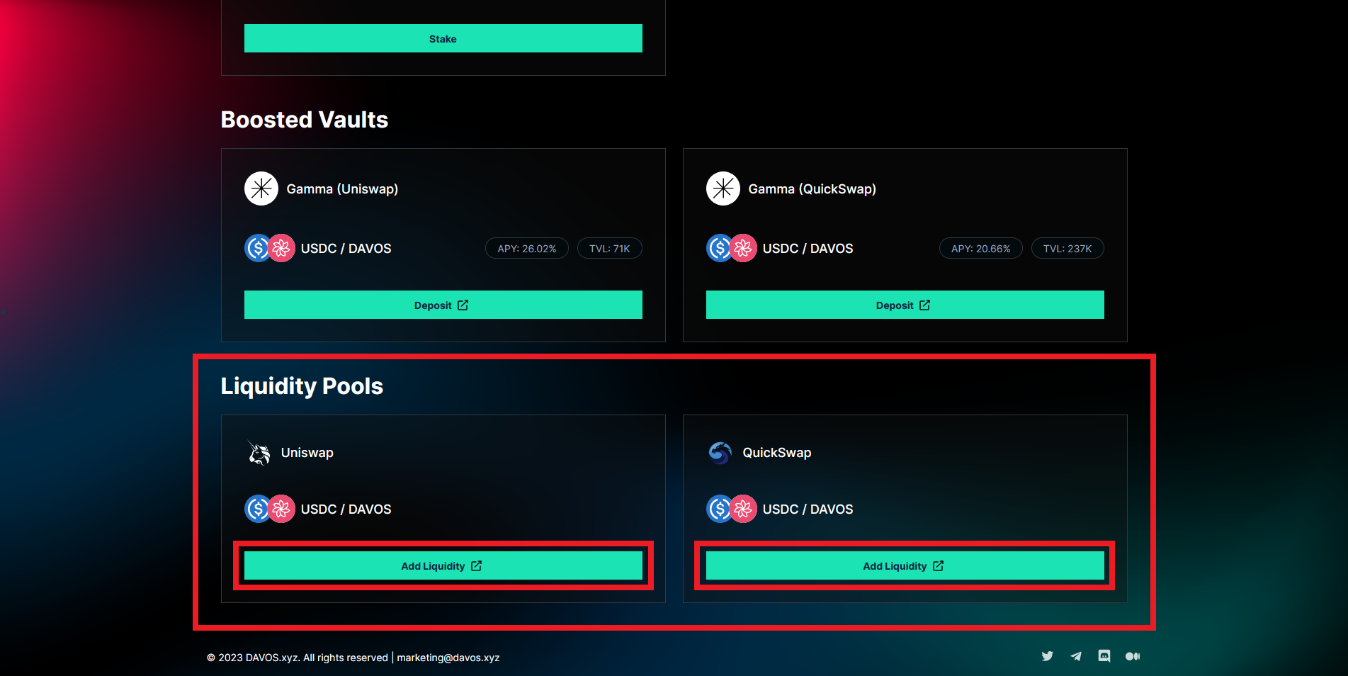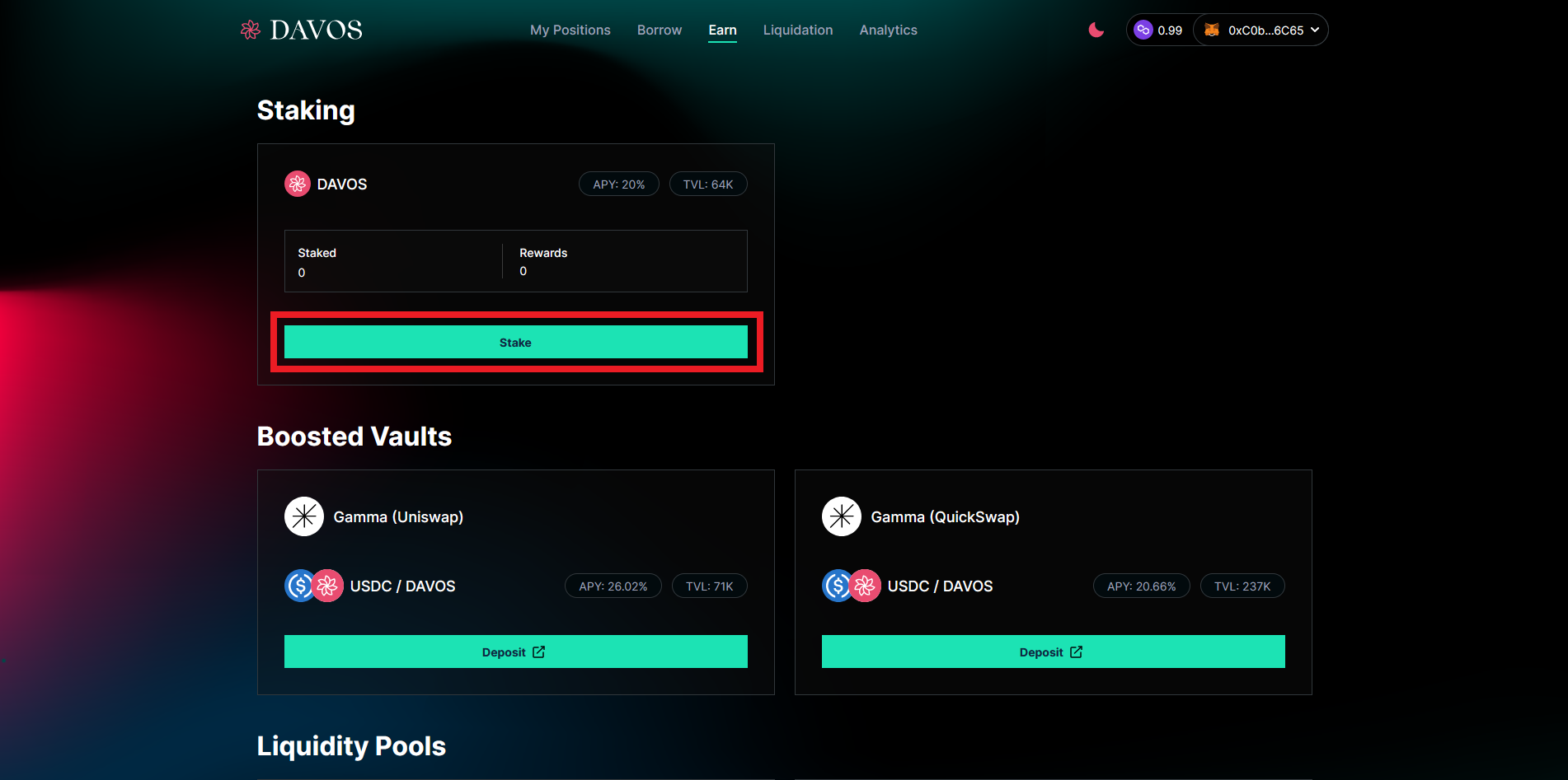 Now go to the "Earn" section, press "Stake" & input an amount of DAVOS.