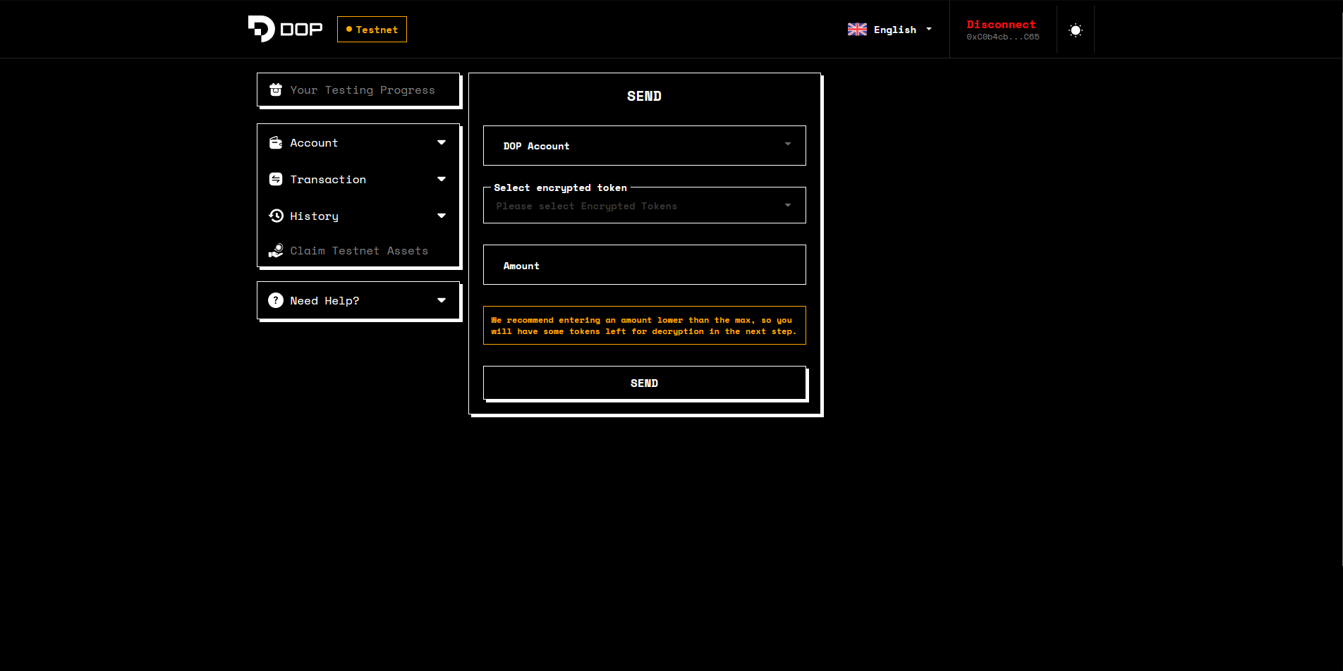 Send Assets: Select "Test DOP Account" from the dropdown, Insert amount (leave a small amount), hit "Send", then "Confirm".