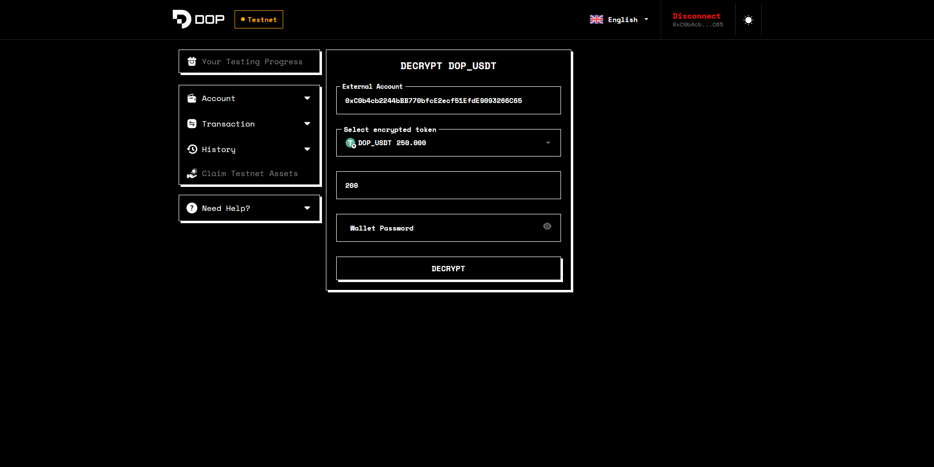 Decrypt Assets: select encrypted assets, insert amount and click "Decrypt".