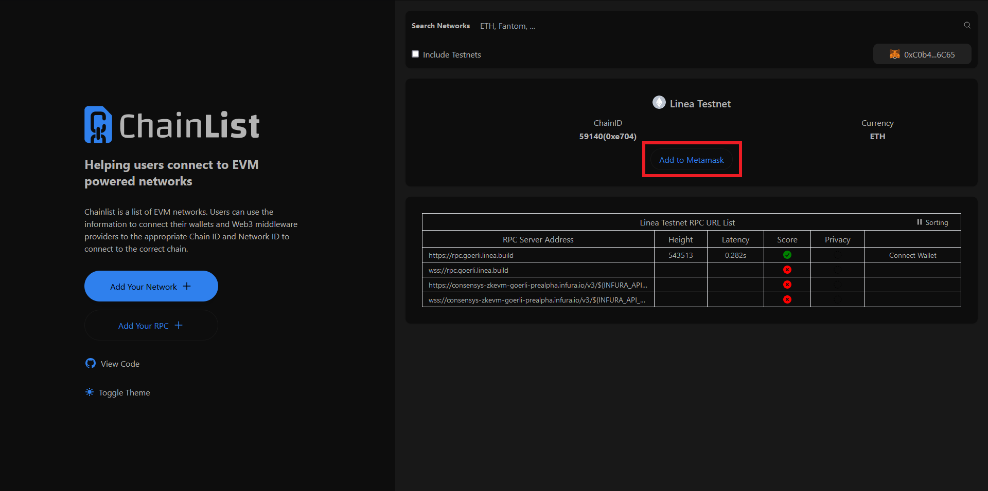 Next, go to chainlist.org/chain/59140 & select "Add to MetaMask".