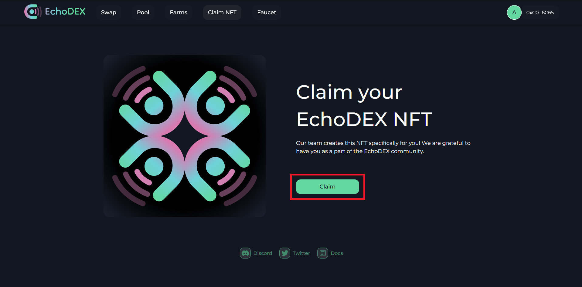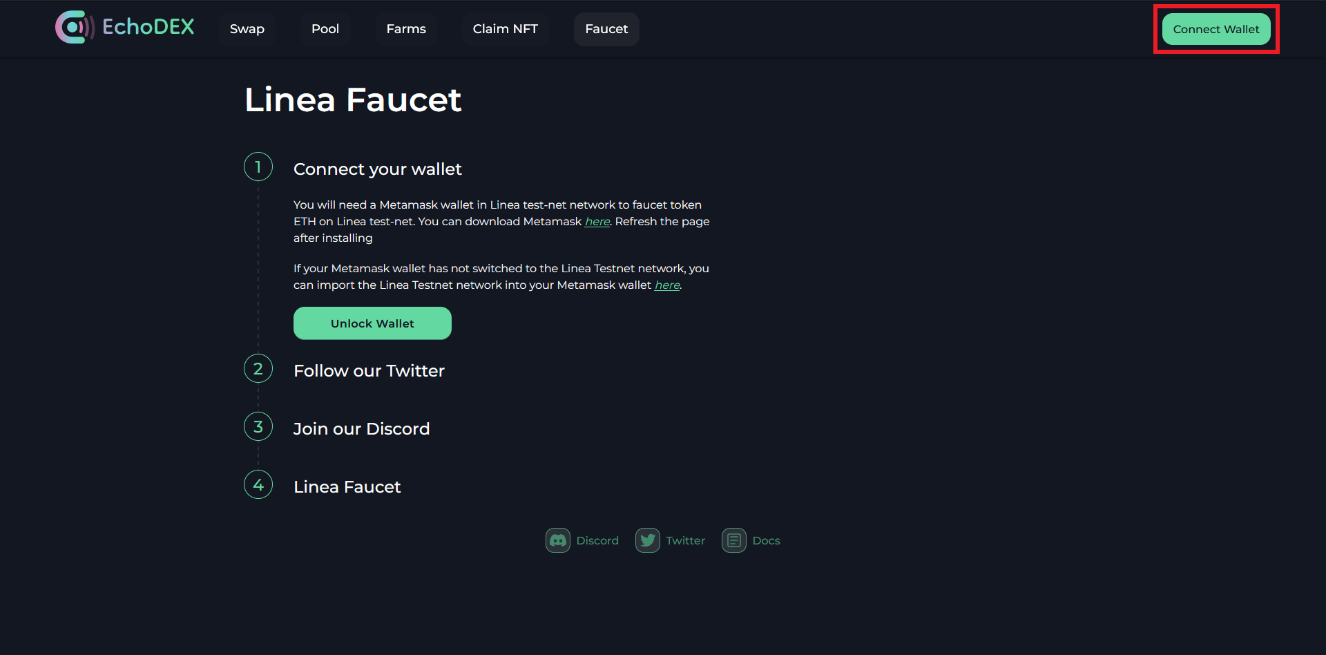 Now go to testnet.echodex.io/faucet & complete the 4 steps, Connect your wallet, Connect Twitter, Connect Discord & verify, and lastly complete the reCAPTCHA then click "Claim".
