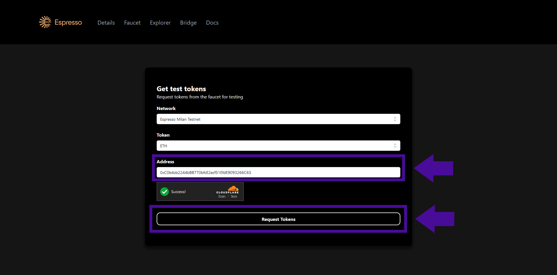 Head over to milan.caldera.dev/faucet, insert your MetaMask wallet address and hit "Request Tokens".