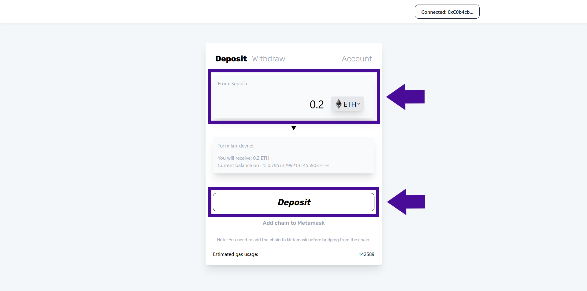 We can also select the "Withdraw" tab to bridge some ETH back to Sepolia from Milan.