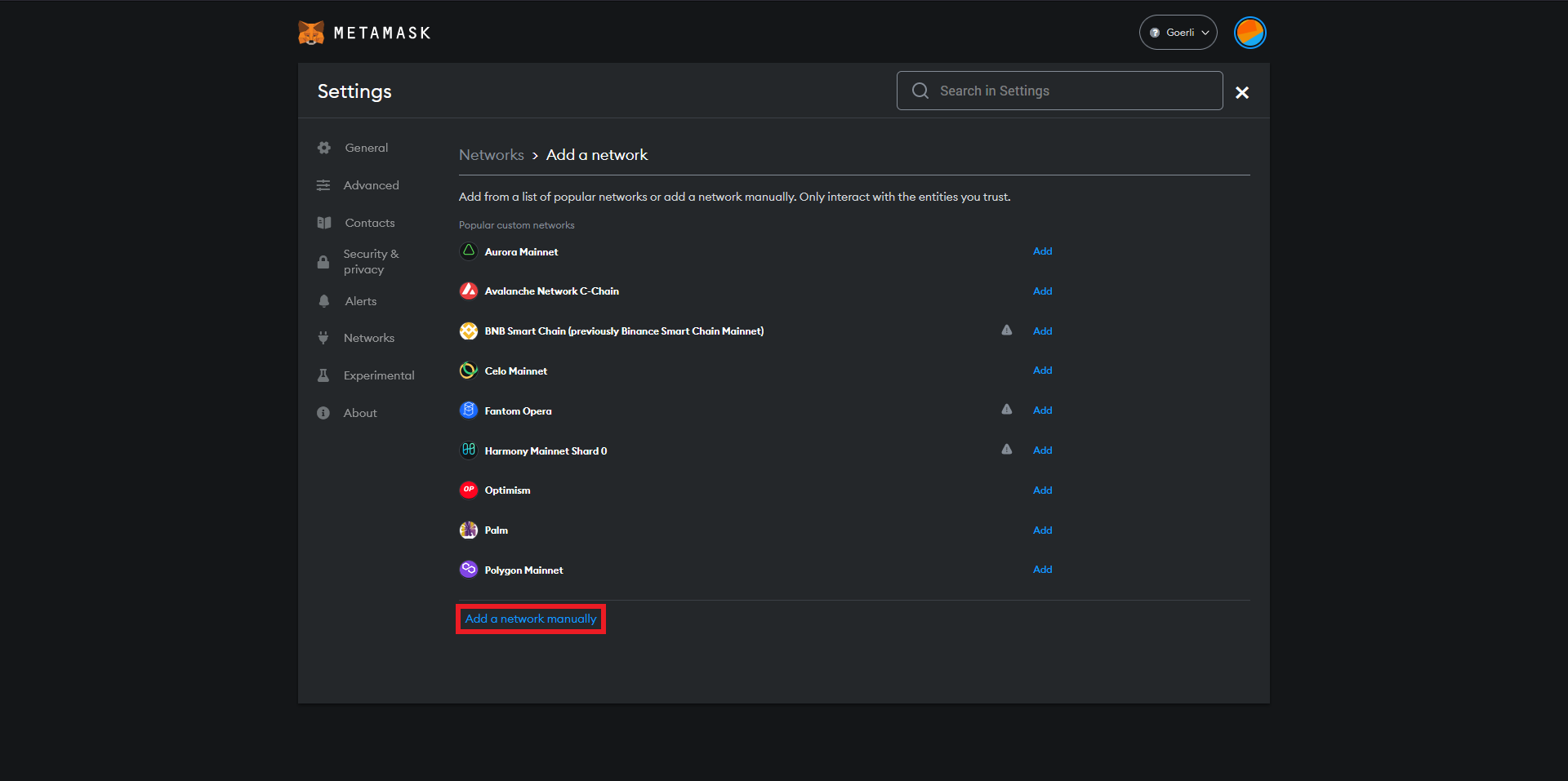 2) Or set it manually in MetaMask by selecting the dropdown and choosing "Add a Network", then input the following details: