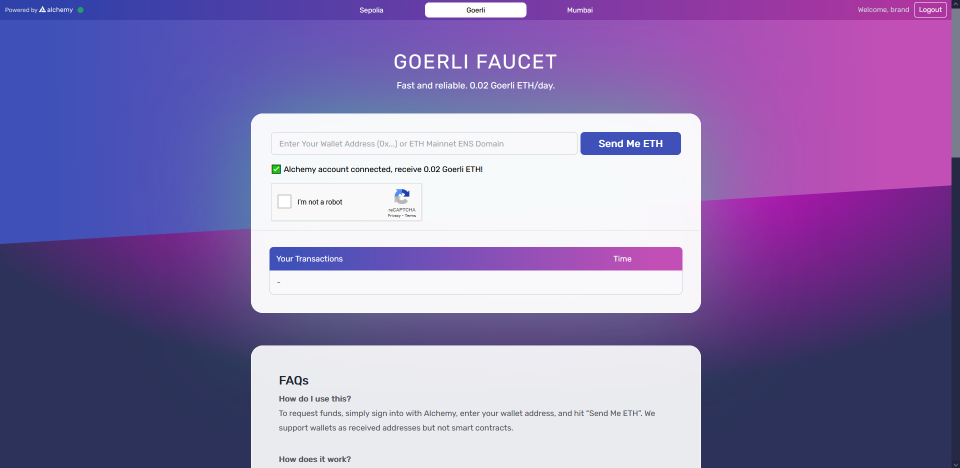 Now we need to claim some test ETH, head over to Goerli Faucet, sign into Alchemy, input your Metamask wallet address & claim ETH.