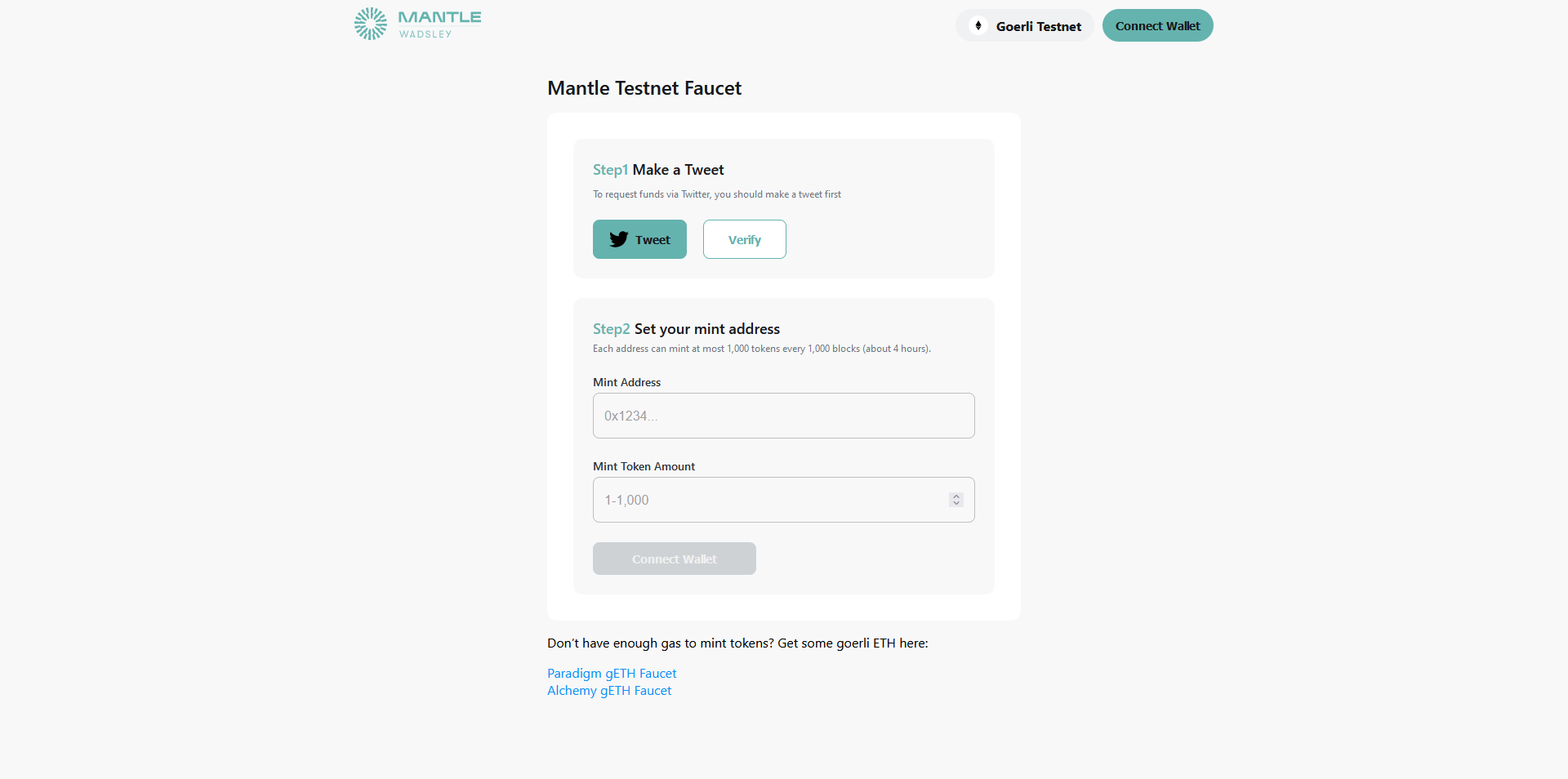 Head over to faucet.testnet.mantle.xyz, connect your wallet then post the tweet & hit "Verify".