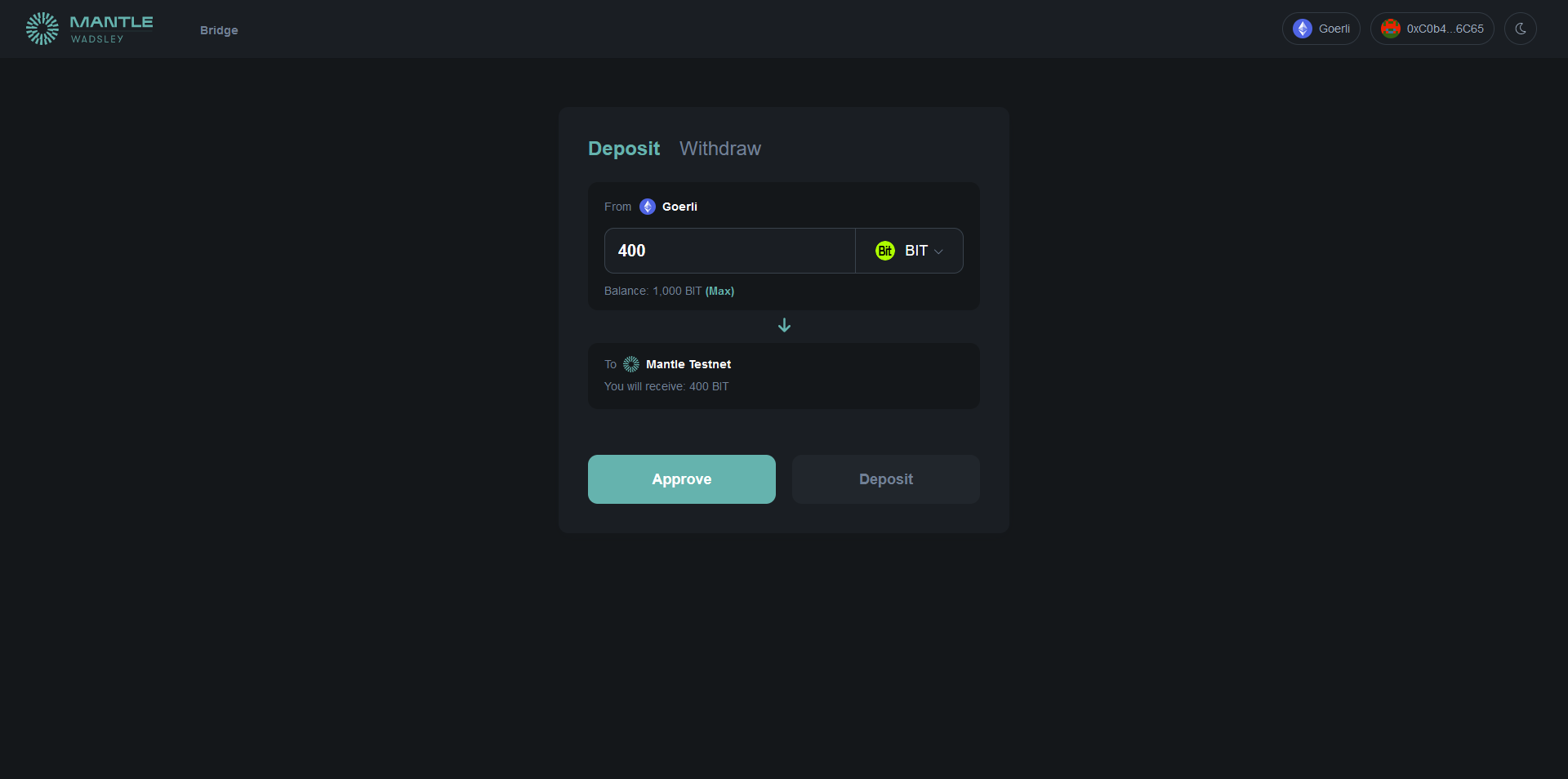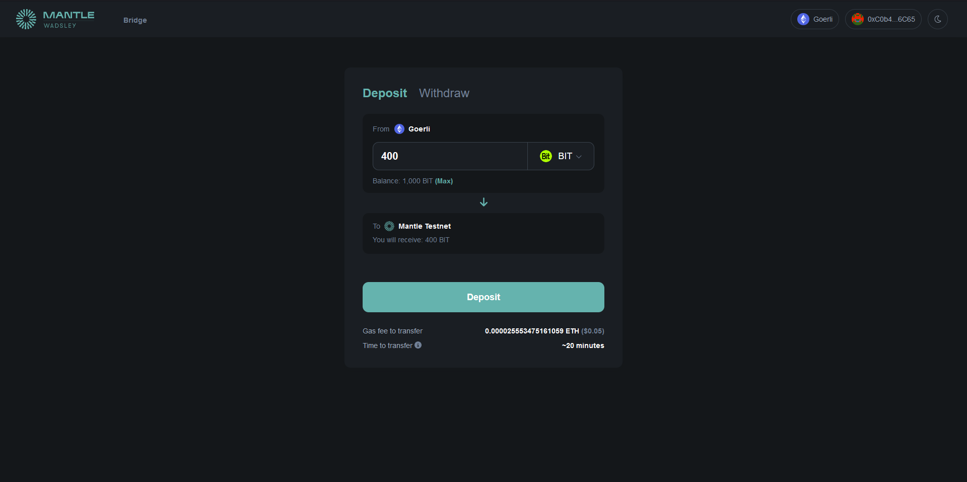 Go to bridge.testnet.mantle.xyz/deposit & connect your MetaMask wallet.