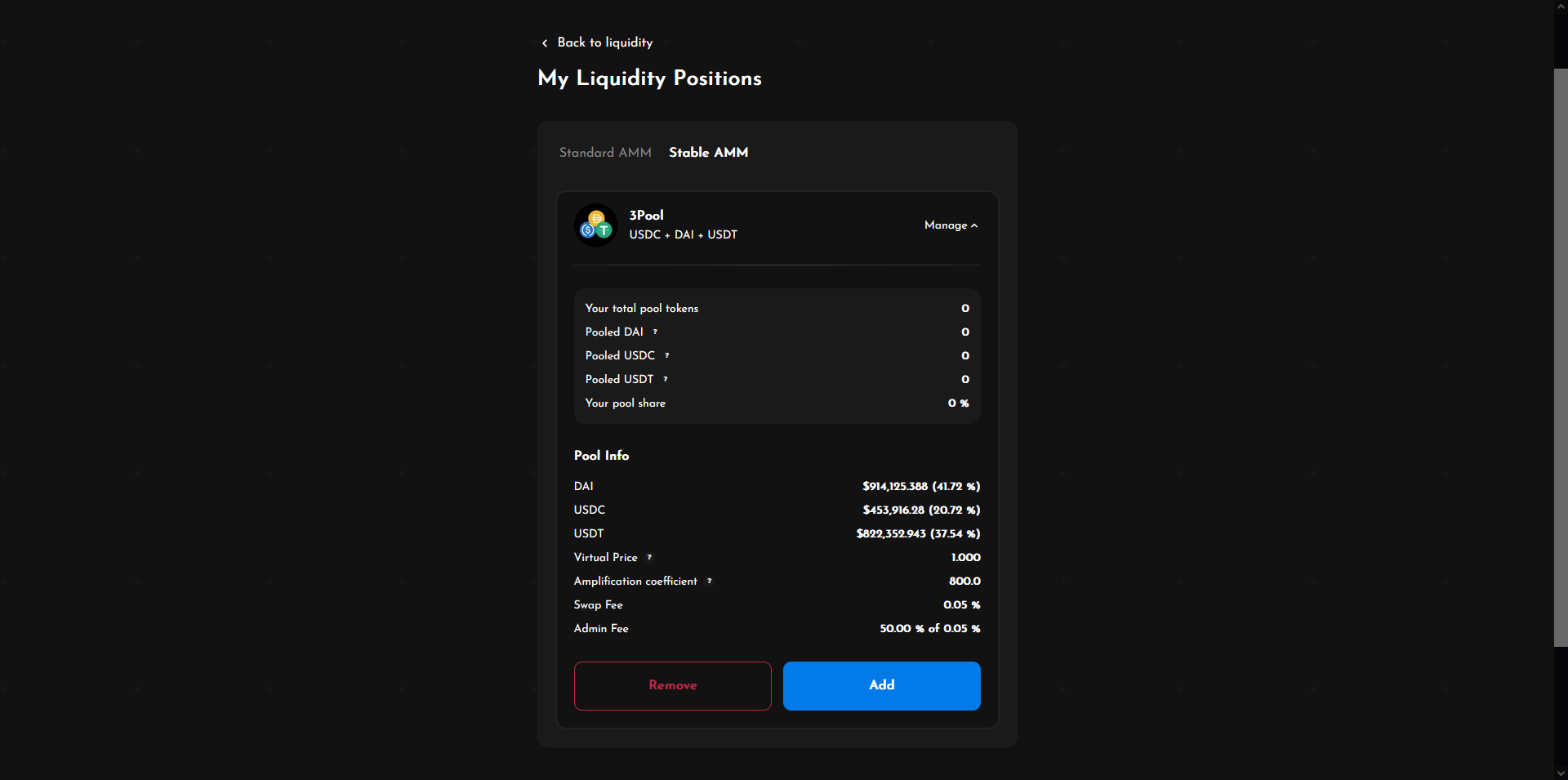 select some stablecoins such as DAI, USDC & USDC, input 20 of each, approve each one and finally confirm transaction!