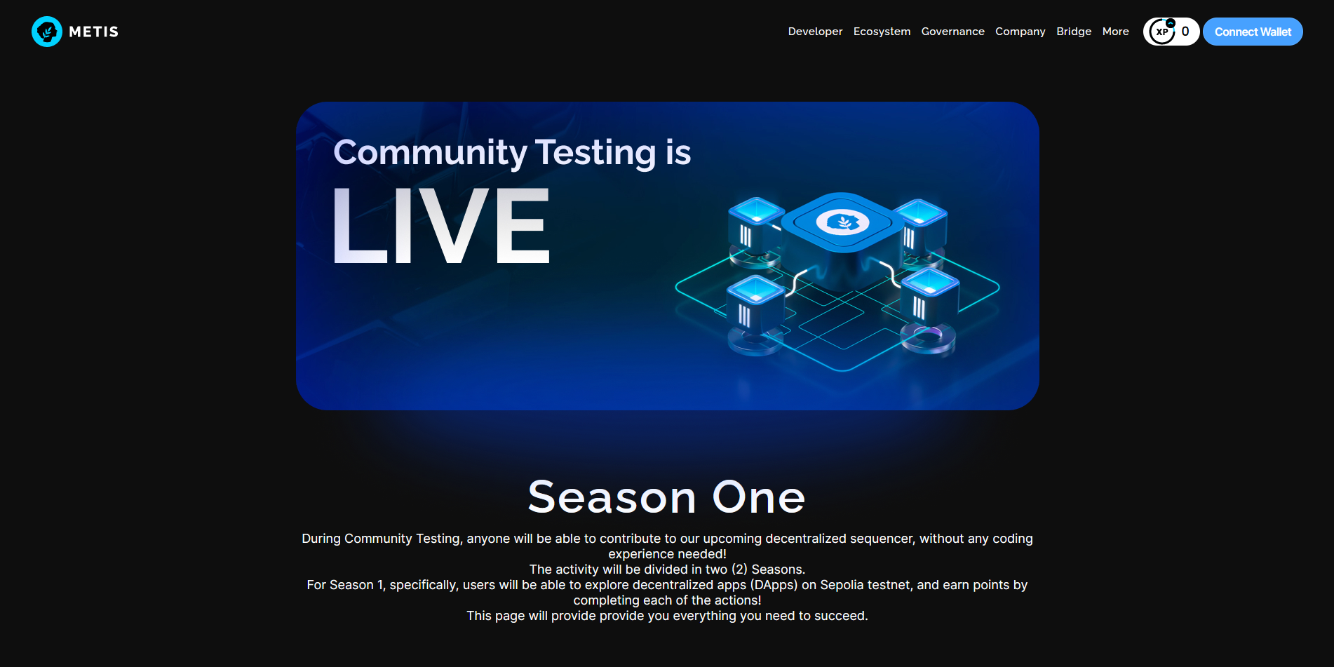 Metis is an open-access Layer 2 network driving the advancement of decentralized applications. The project is dedicated to leading the creation of the initial Ethereum Layer 2 rollup with a decentralized sequencer. Season 1 provides an opportunity for community testing of the Proof-of-Stake Sequencer Pool.