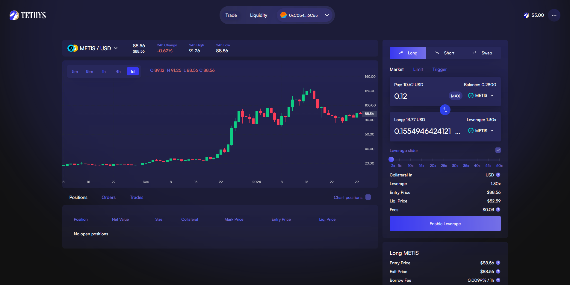 Now let's open a Long or Short position by inserting at least $10 worth of test tokens and clicking "Enable Leverage", confirm transaction and then click "Long METIS".