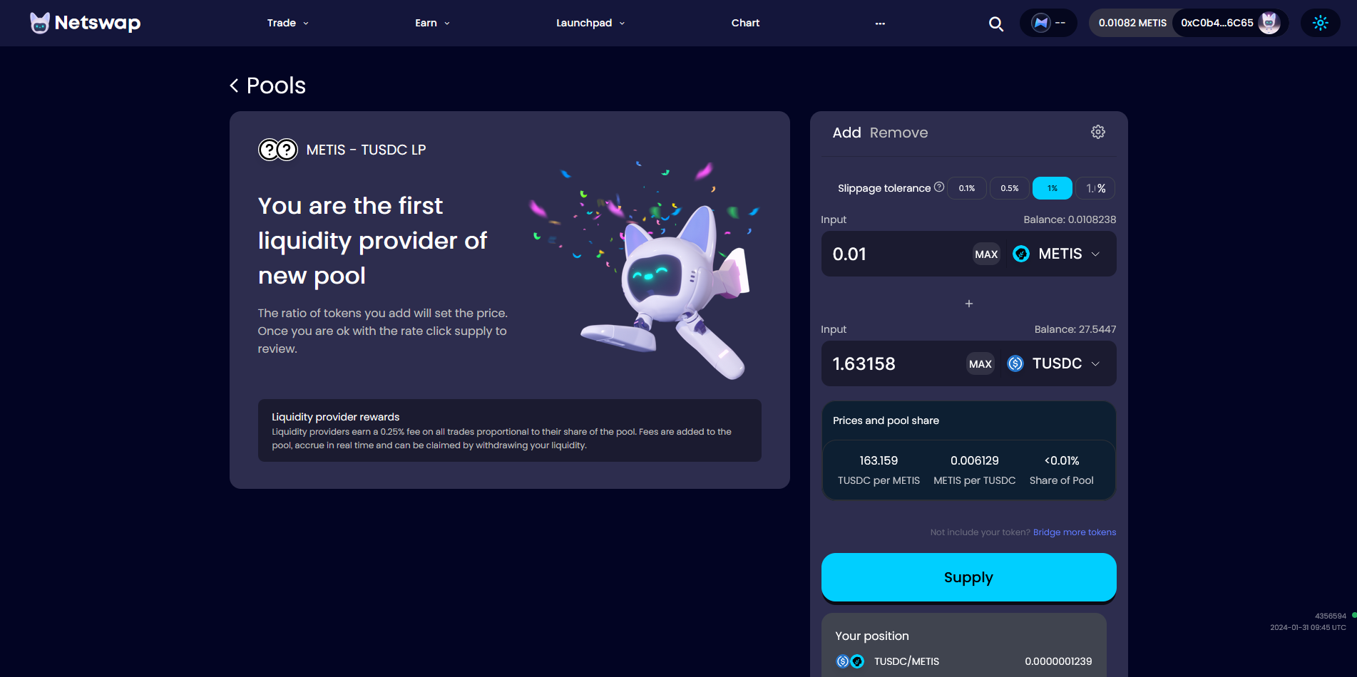 Now let's provide Liquidity, go to the "Trade" tab and click "Pool", then "Create Pool", enter amount, approve, "Supply", "Confirm Supply".
