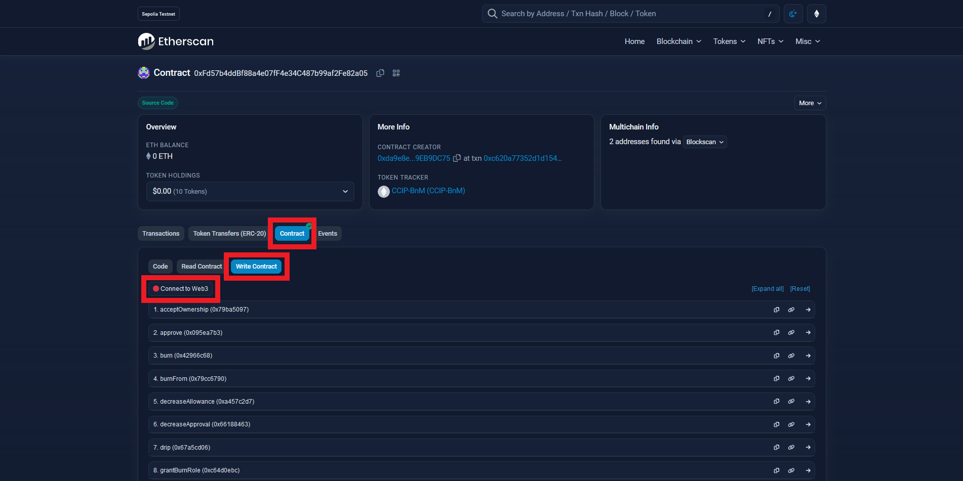 To do this, we need to head over to Etherscan & select the "Contract" button, then "Write Contract" and lastly, click the "Connect to Web3" button to connect your MetaMask wallet.