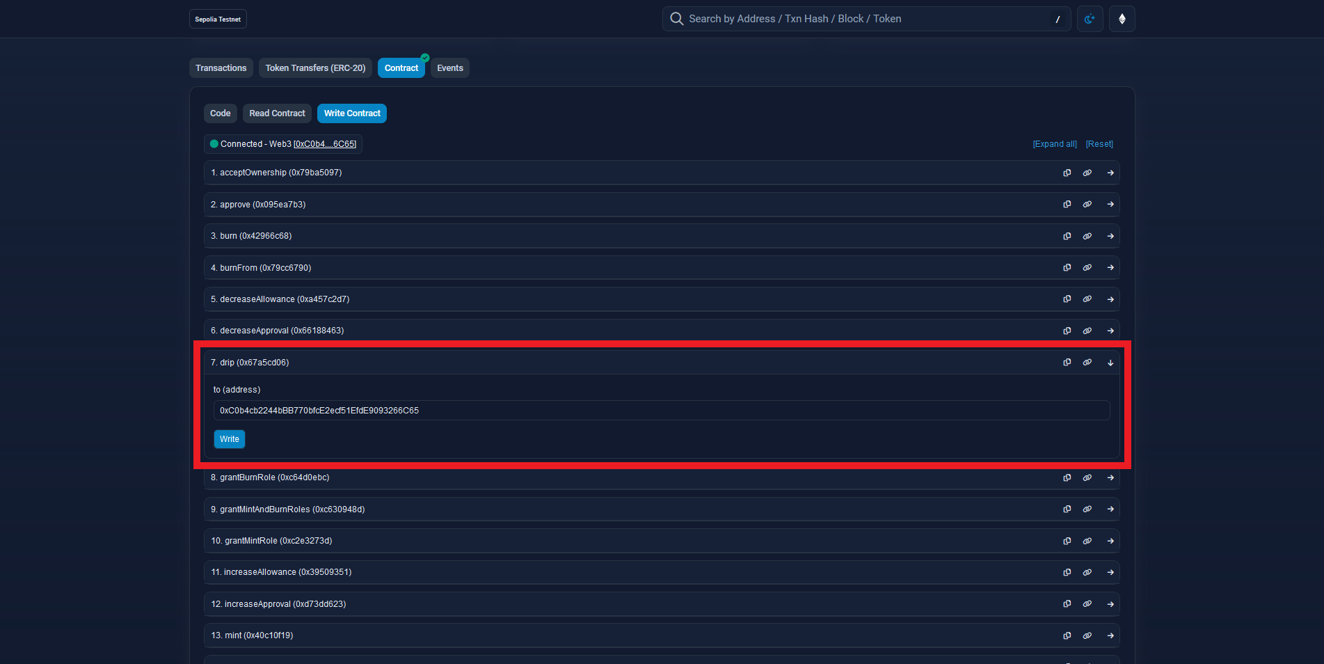Next, we need to select the "drip" function, insert your wallet address and click "Write".