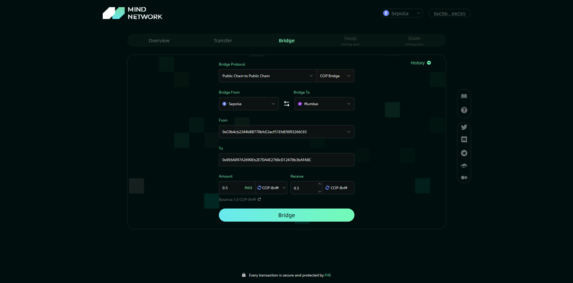 Now let's go back to dapptest.mindnetwork.xyz & select the "Bridge" tab.