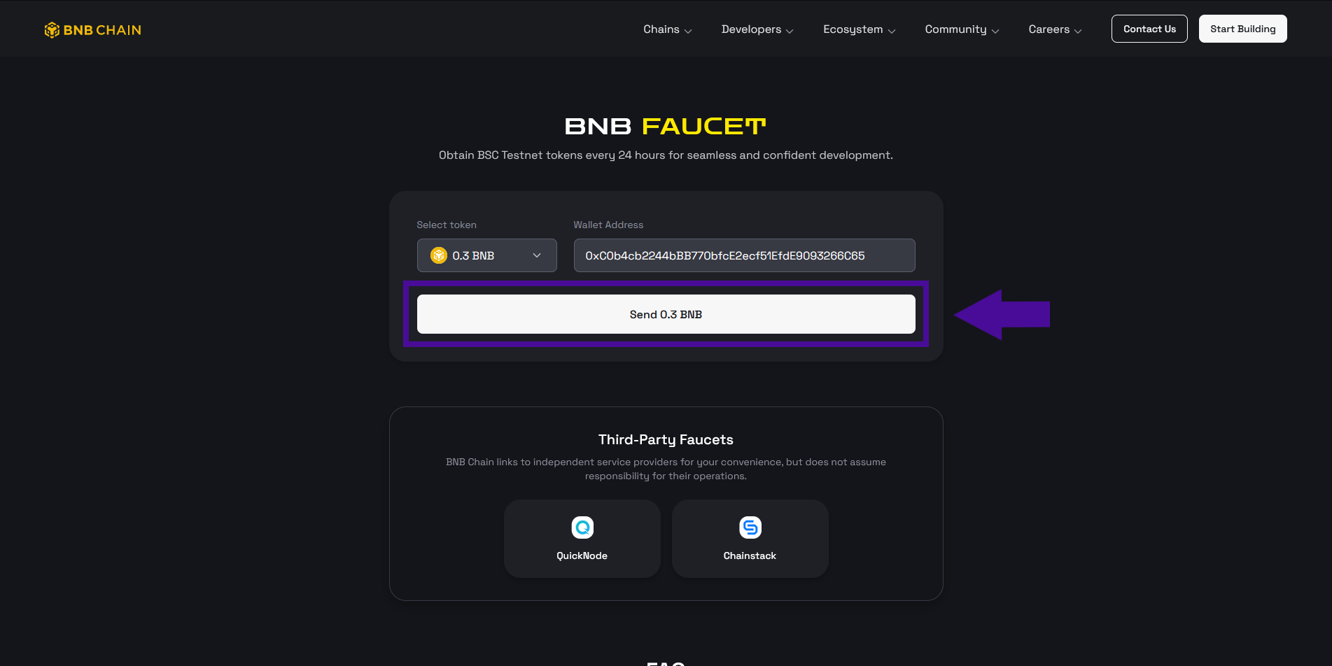 First, go to bnbchain.org/en/testnet-faucet, insert your wallet address and click "Send 0.3 BNB".