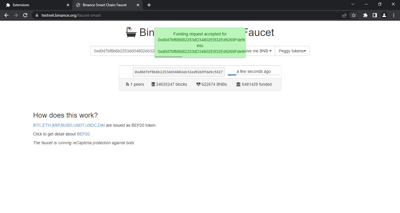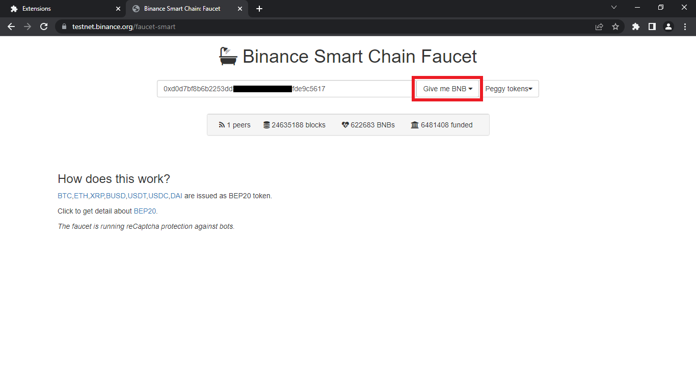 Now go to BNB Testnet Faucet & paste your wallet address into the box.