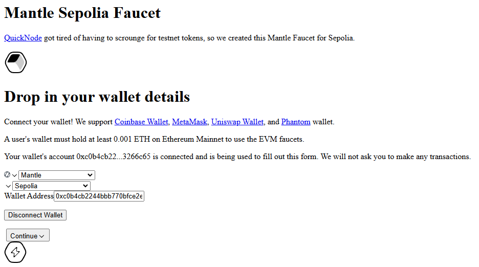 Head over to Mantle Sepolia Faucet: faucet.quicknode.com/mantle/sepolia, connect your wallet and claim.