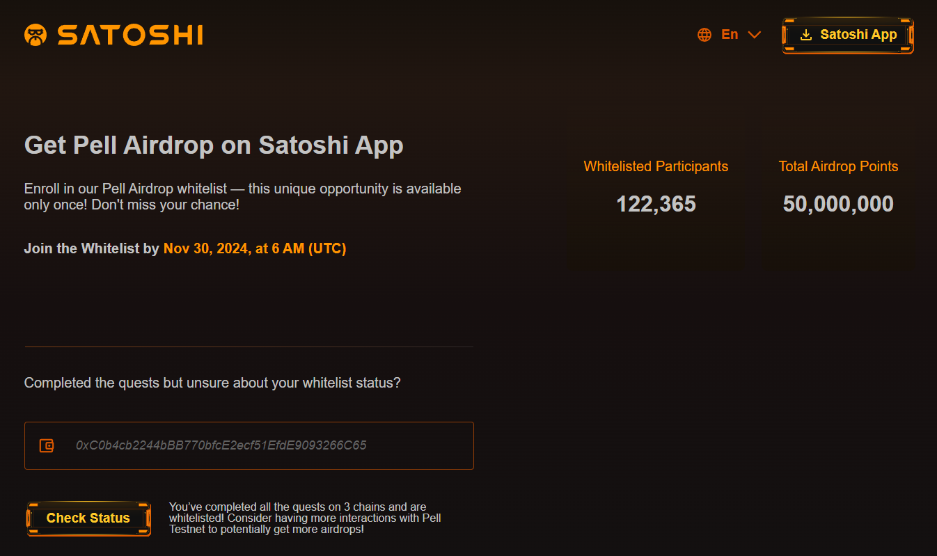 Finally, let's head over to SatoshiApp & insert our wallet address to check if we're whitelisted for the airdrop!
