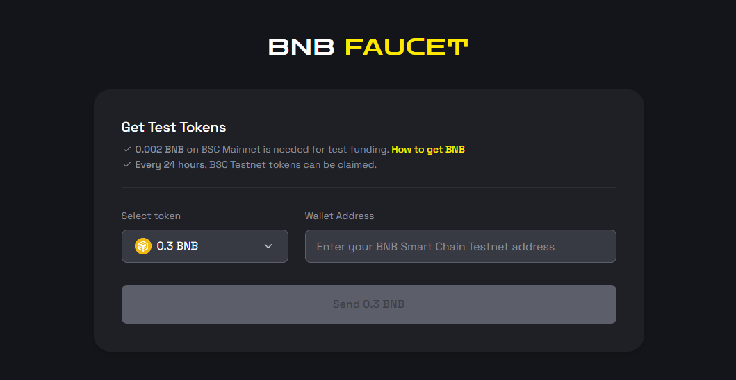 You will need 0.002 BNB in your wallet on Mainnet to claim from this faucet.