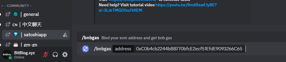 Go into the "satoshiapp" channel & type /mantlegas then insert your address.