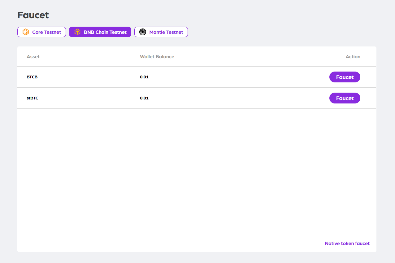 Then select the BNB Chain Testnet tab at the top and repeat the process for all assets.