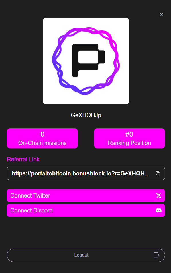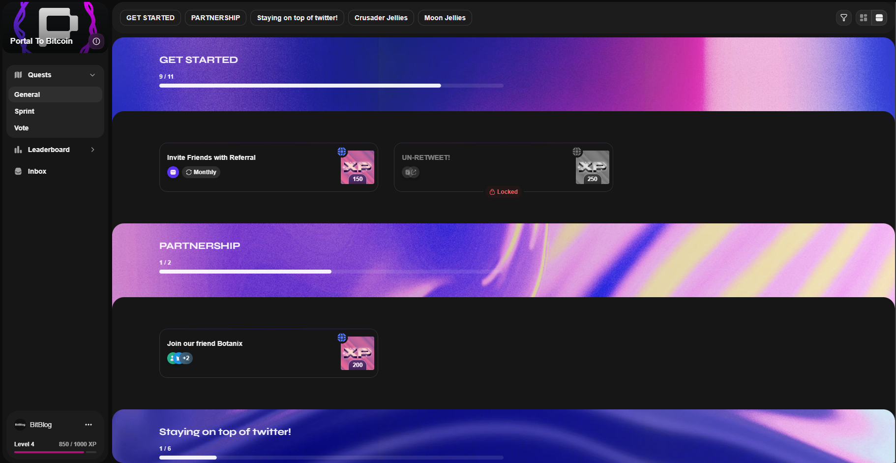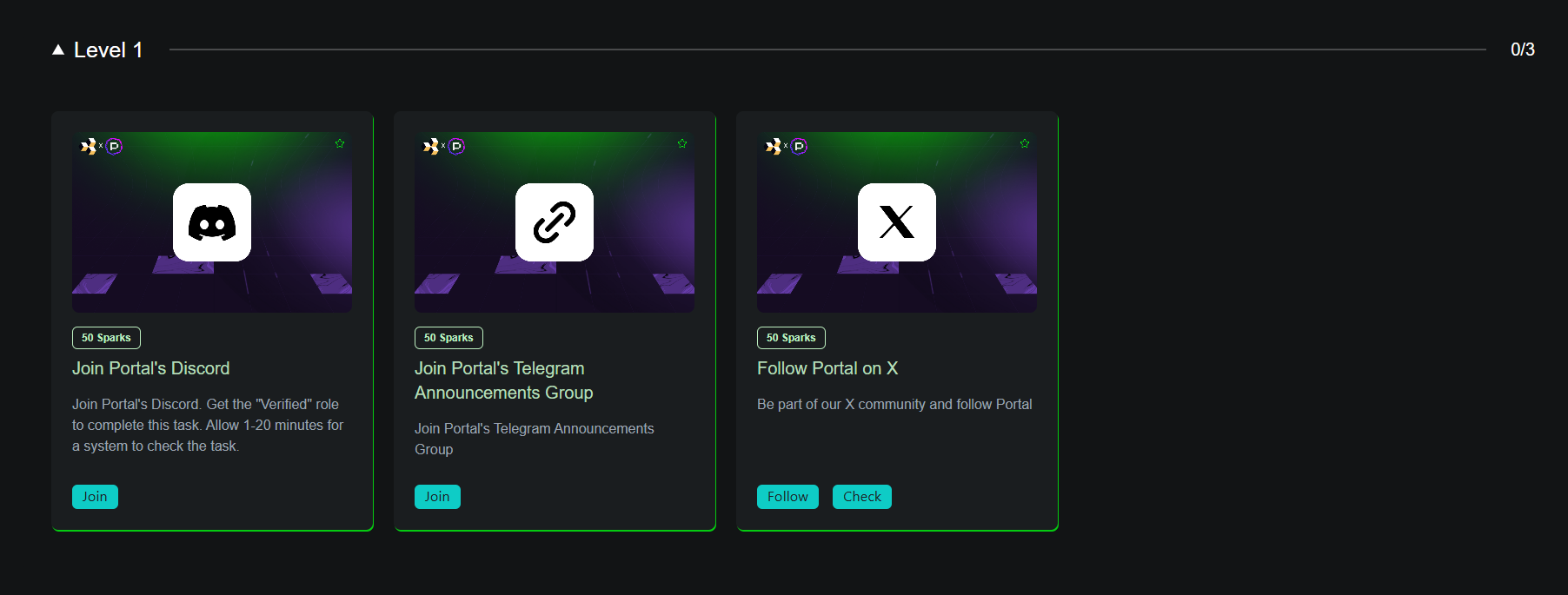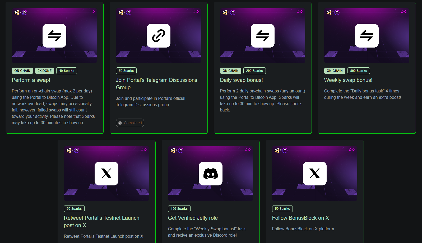 To do this, you'll need to join the Portal Community over on Zealy & complete some simple tasks. You should also go to the Account Settings and bind your Discord account and input your Bitcoin wallet address from Portal DEX.