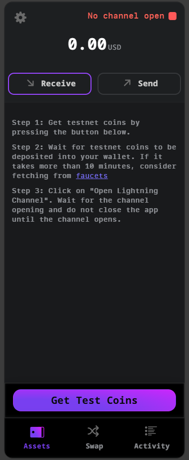 Now if we open the Portal DEX extension again we should begin loading a channel, after this we can press "Get Test Coins" to receive some test tokens.