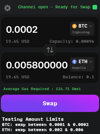 Wait for the 3 confirmations and then once you have a channel open you can start performing swaps between Bitcoin & Ether.