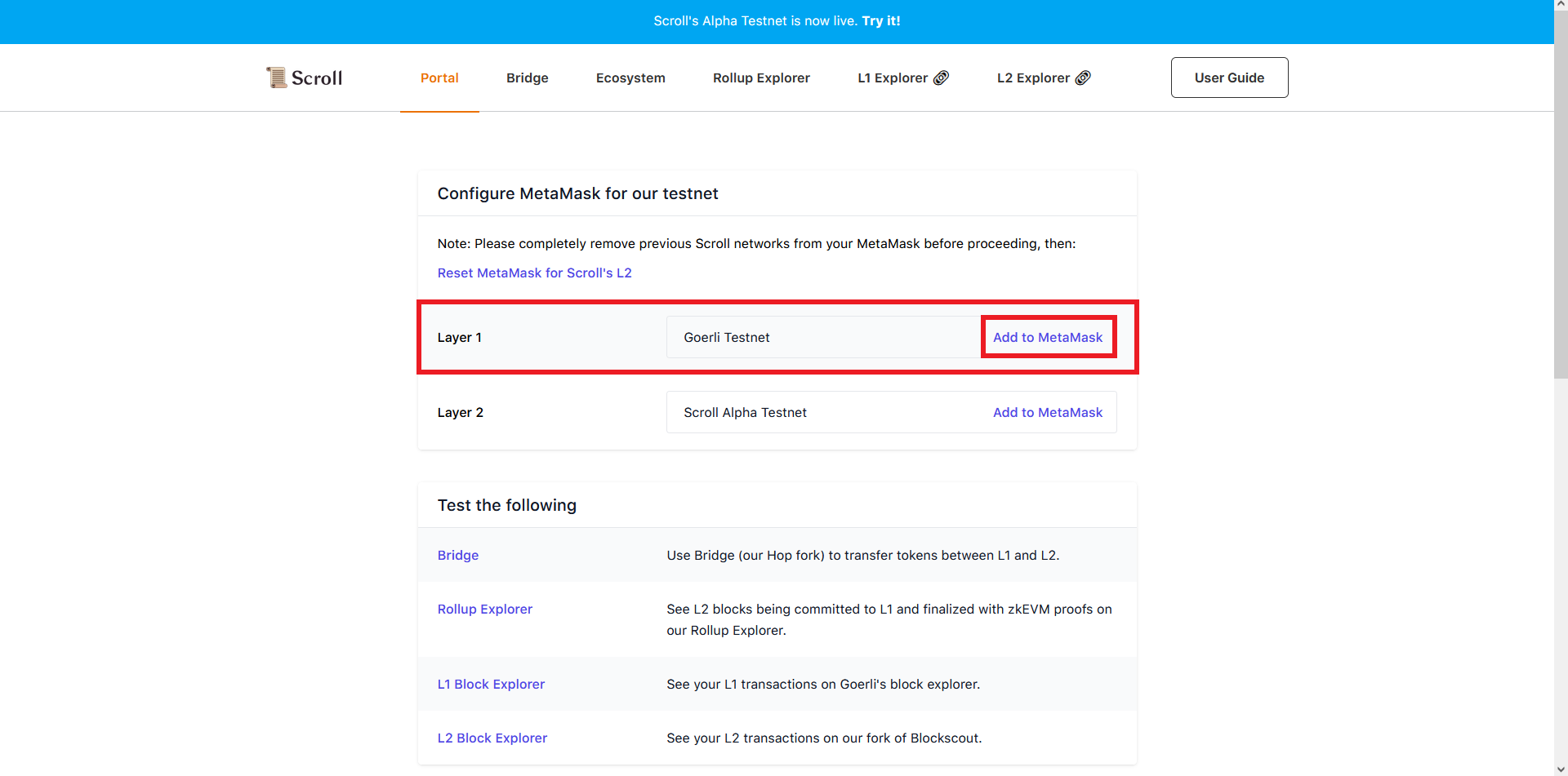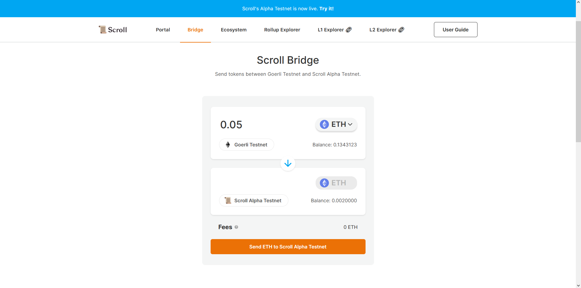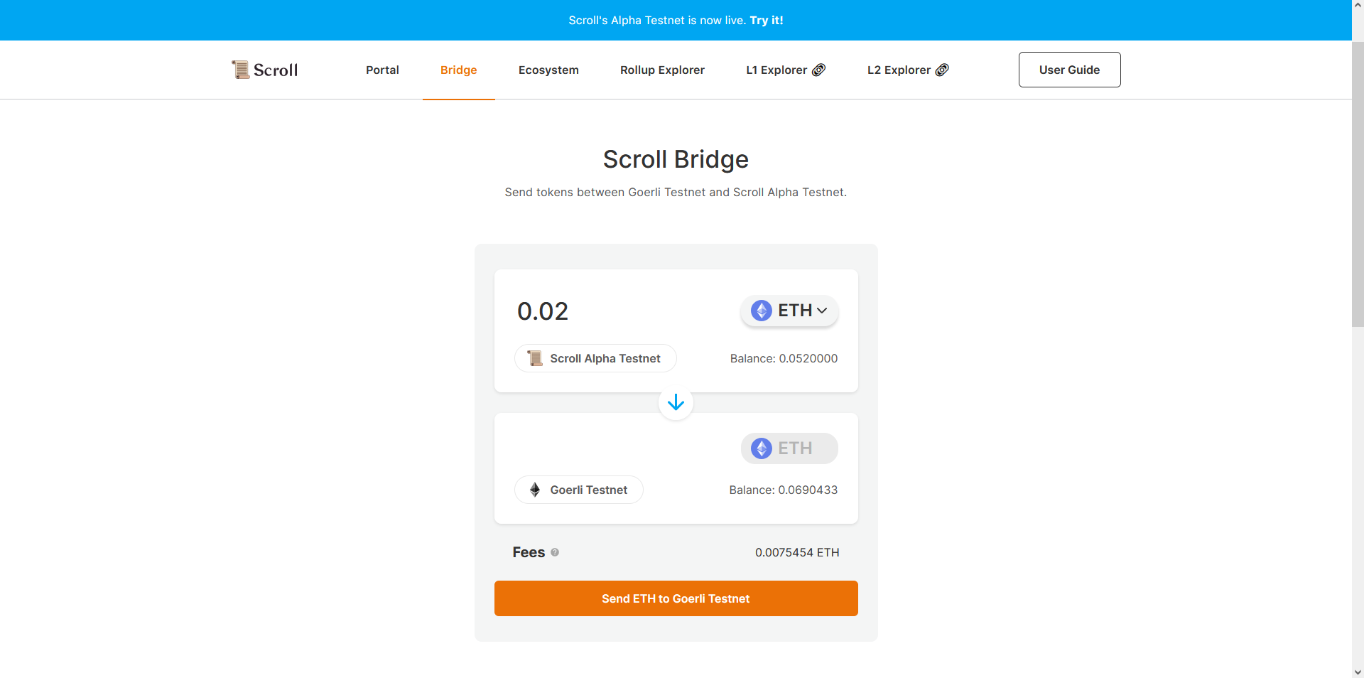 Now go back to scroll.io/alpha & bridge some ETH back to Goerli Testnet.