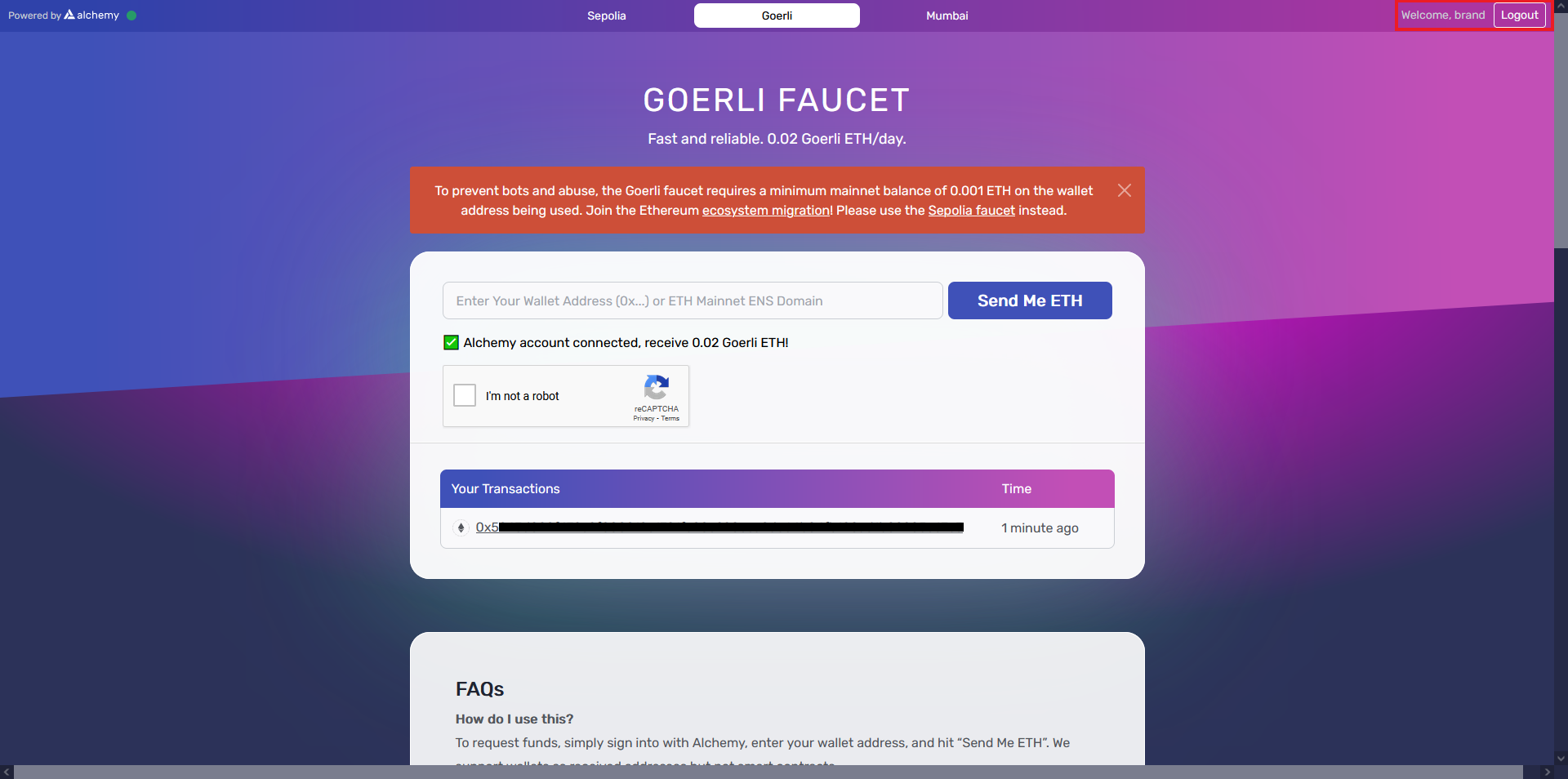 Now go to the Goerli Faucet & login to Alchemy in the top right corner.