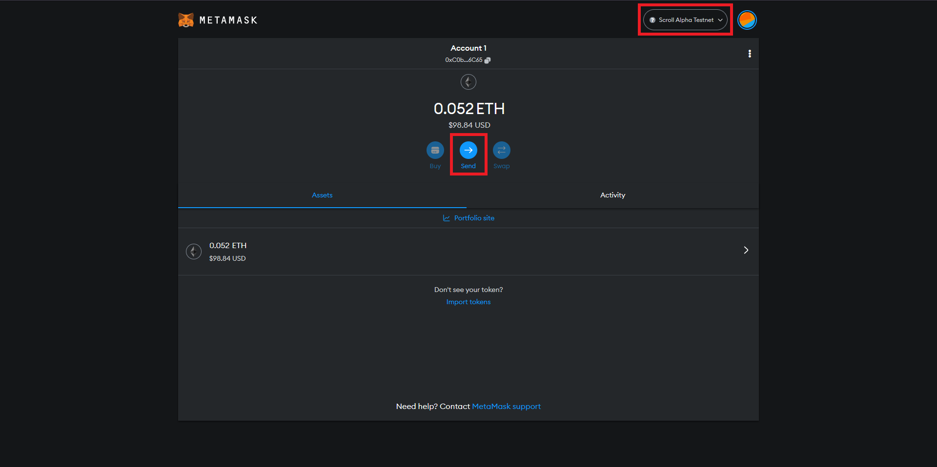 Check that it says "Scrollnet Alpha Testnet" at the top, and then send some ETH to any random address.