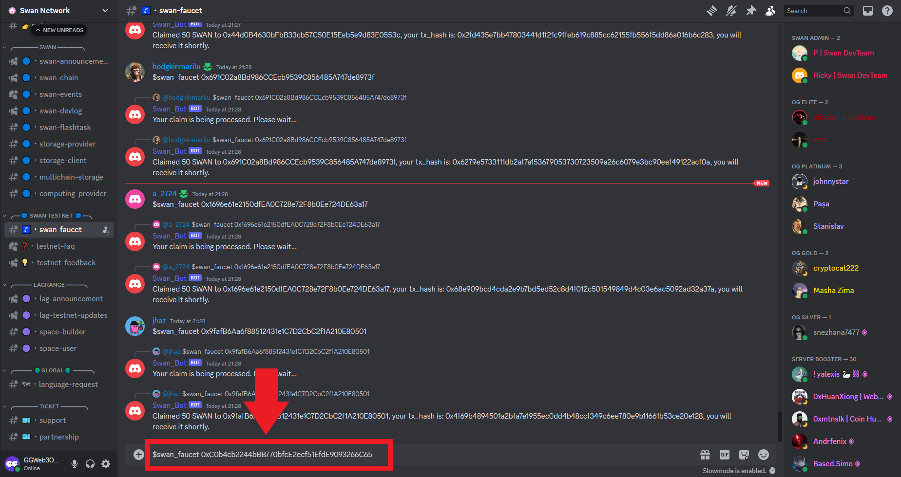 Type: $swan_faucet your_wallet_address as seen in the image below.
