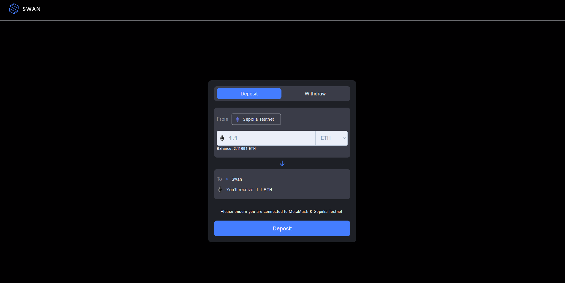 We can also click the "Withdraw" tab to bridge ETH back to Sepolia from Swan Network.