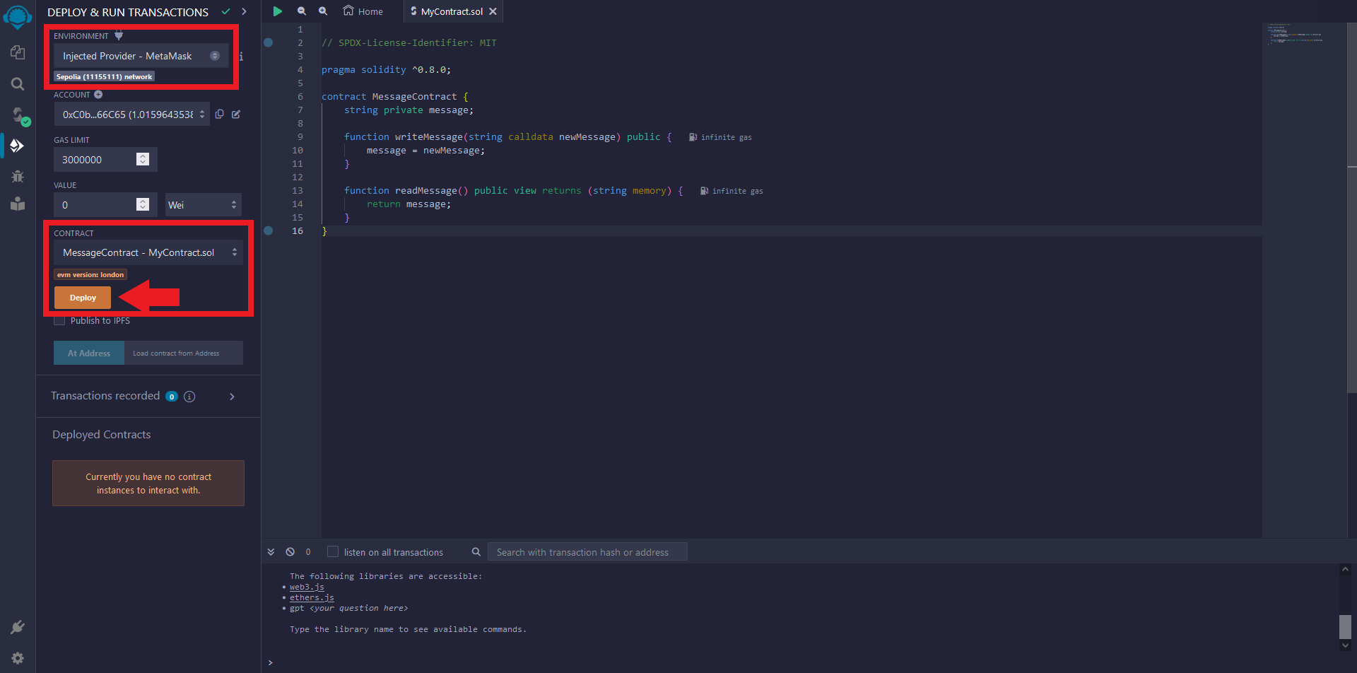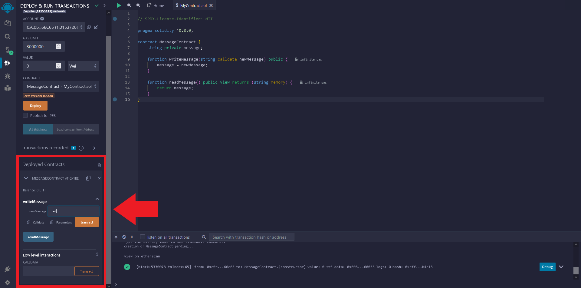 Now let's interact with the contract, press the "Deployed Contracts" dropdown, then the "writeMessage" dropdown and type a new test message.
