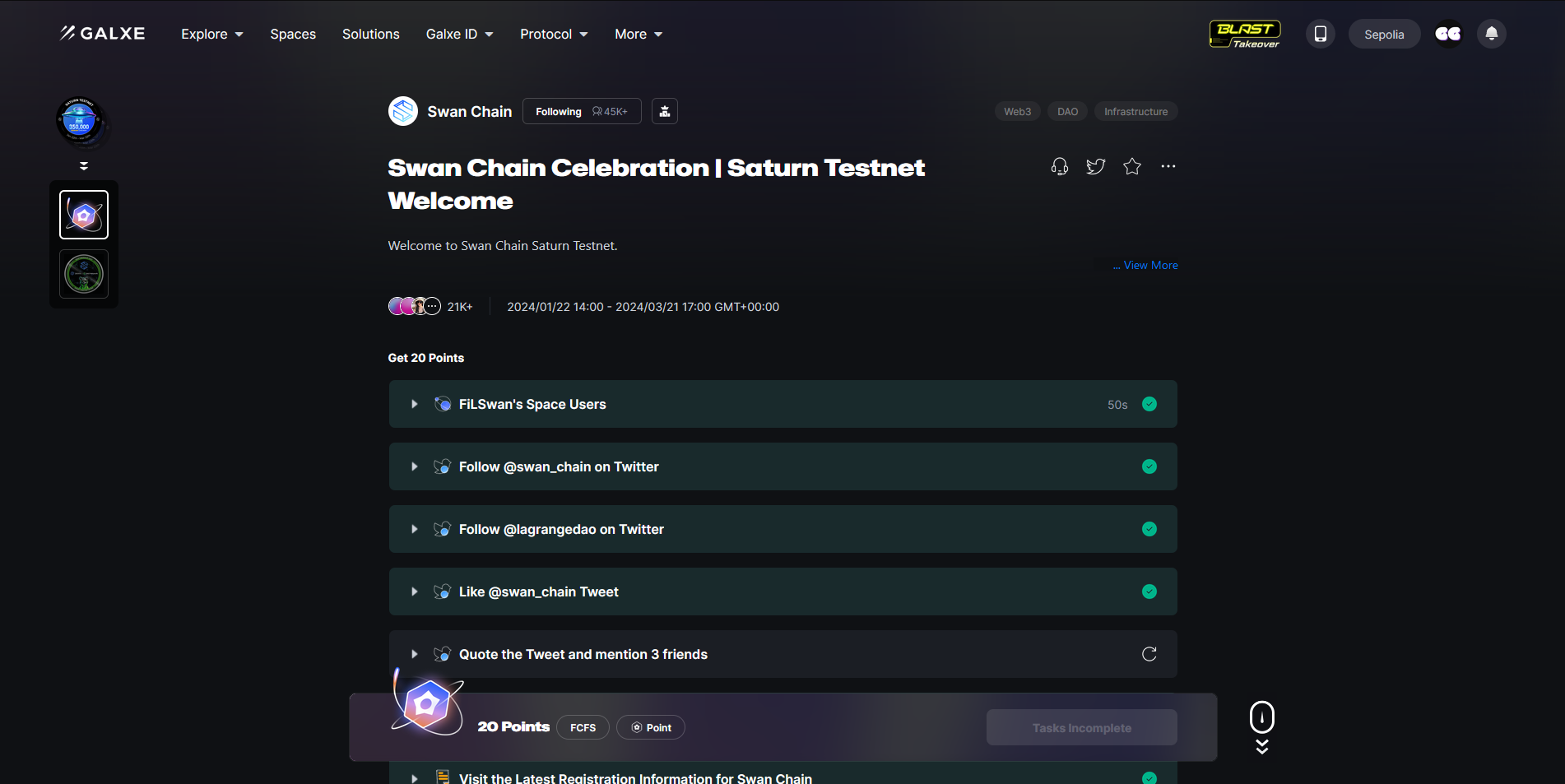 Finally, let's head over to the Swan Galxe Campaign & complete all the tasks for 20 points.