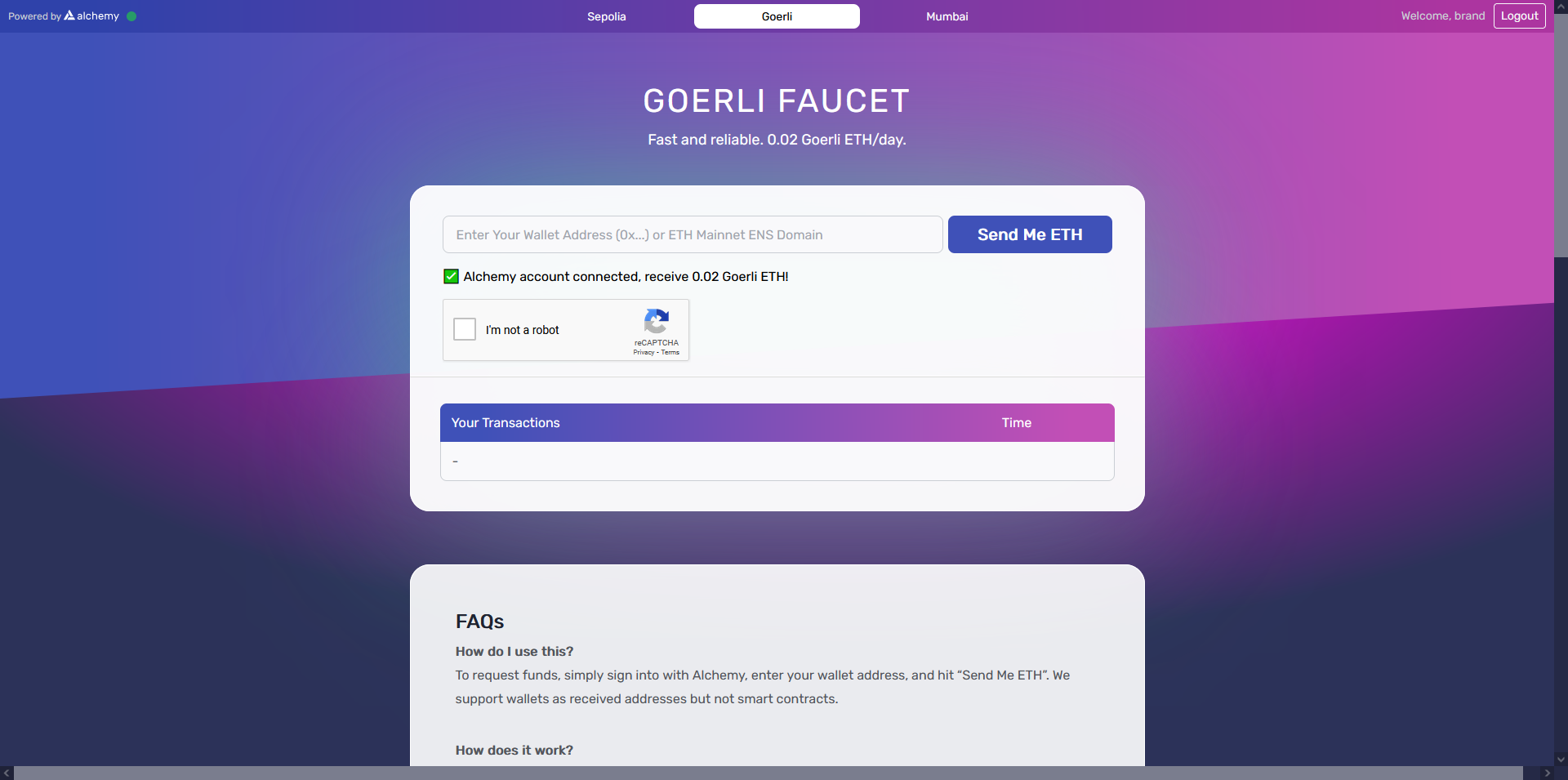 Now we need to claim some test tokens, to do this, go to goerlifaucet.com, login to Alchemy in the top right corner, then insert your ETH wallet address (from MetaMask) and hit "Send me ETH".