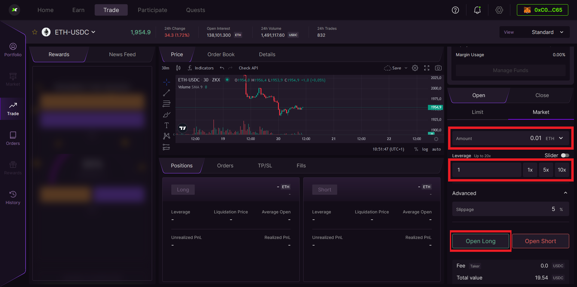 On the right side, insert any amount of ETH, select how much leverage you want to use, then hit "Open Long".