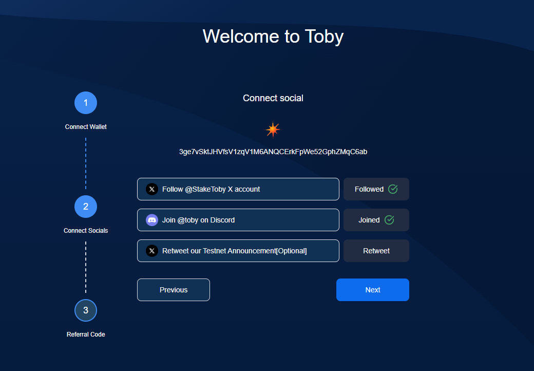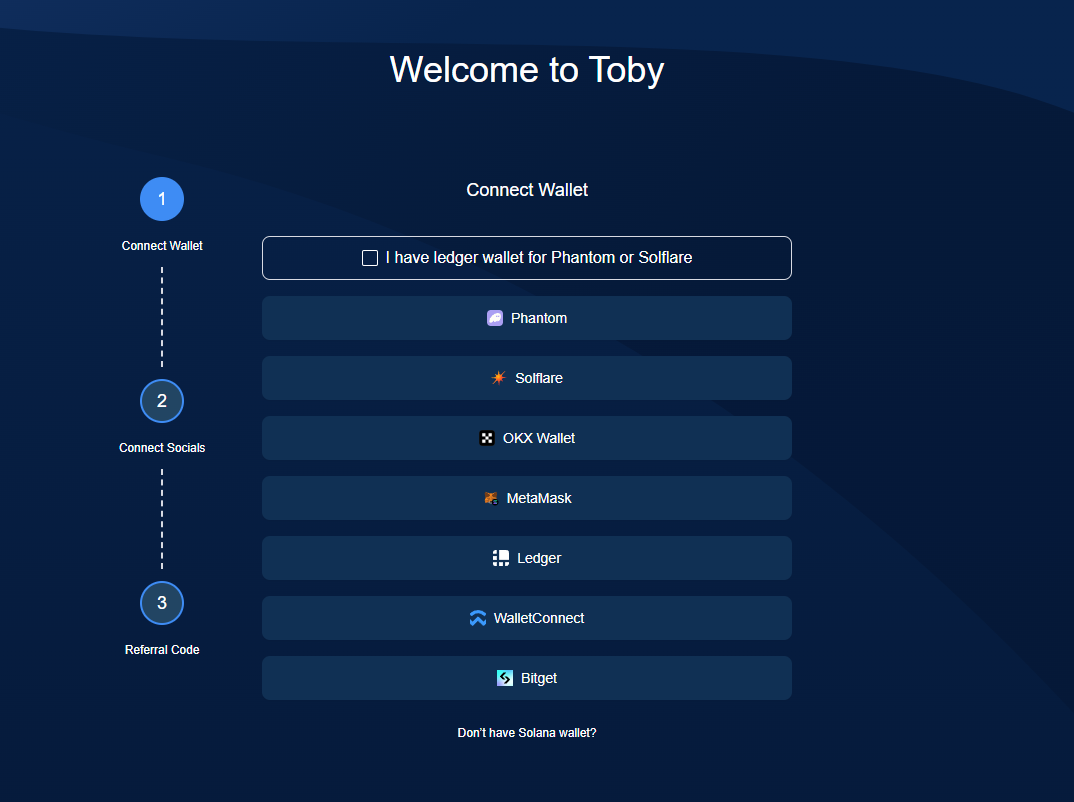 For the first step we just need to head over to the testnet: testnet.toby.foundation/onboarding & connect a SOL wallet.