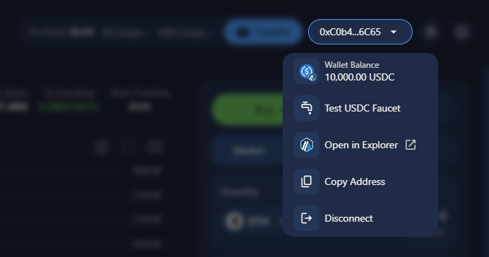 Now we need to press the wallet address drop-down in the top-right corner, select "Test USDC Faucet" & request some test tokens.