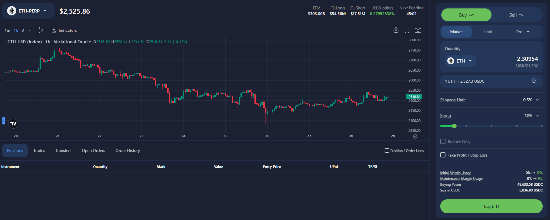To create a BUY position, we need to use the slider on the right to choose how much of our test funds we want to use.