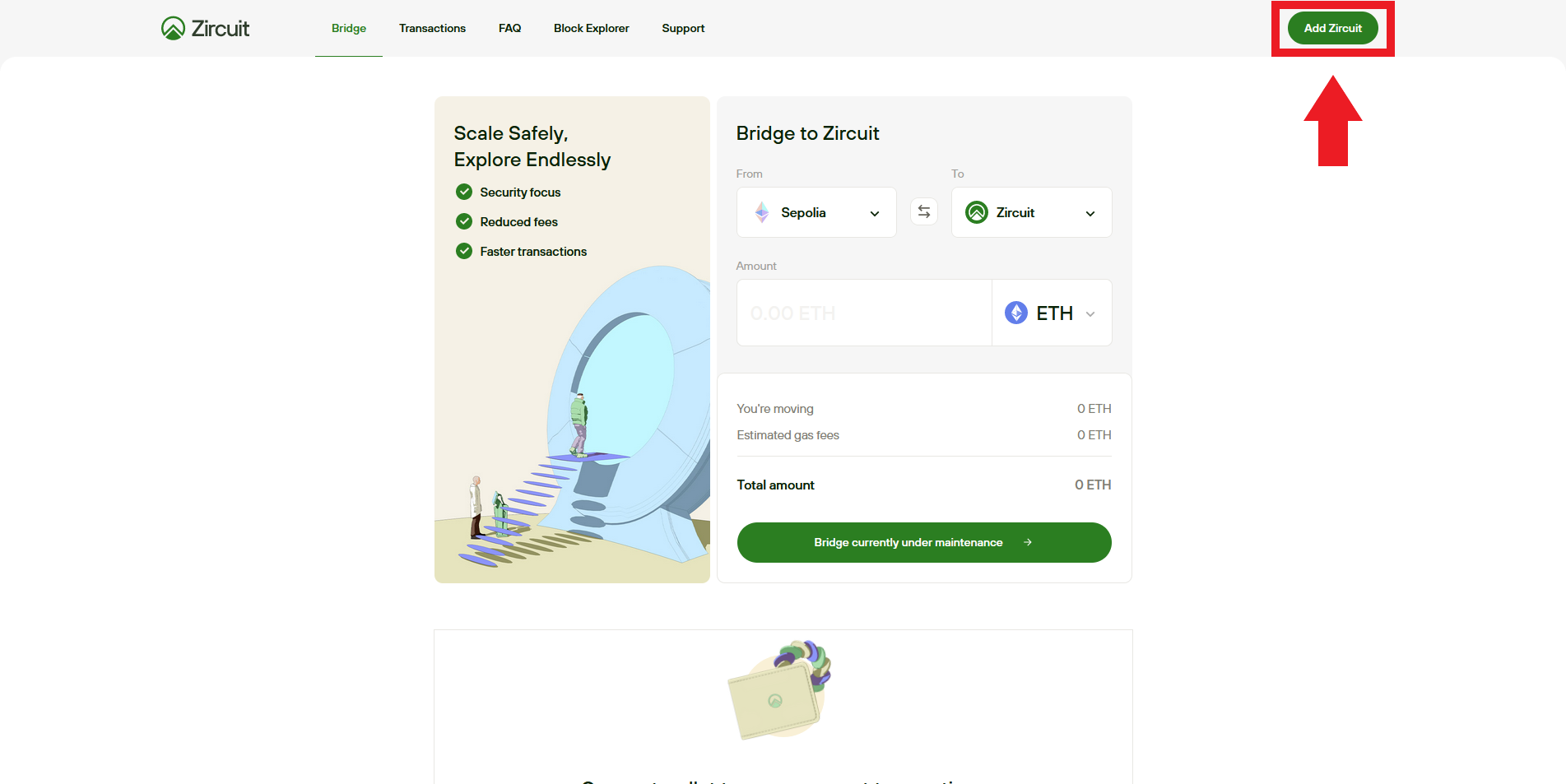 To do this, head over to bridge.zircuit.com and click "Add Zircuit", this will add the network to your MetaMask wallet.