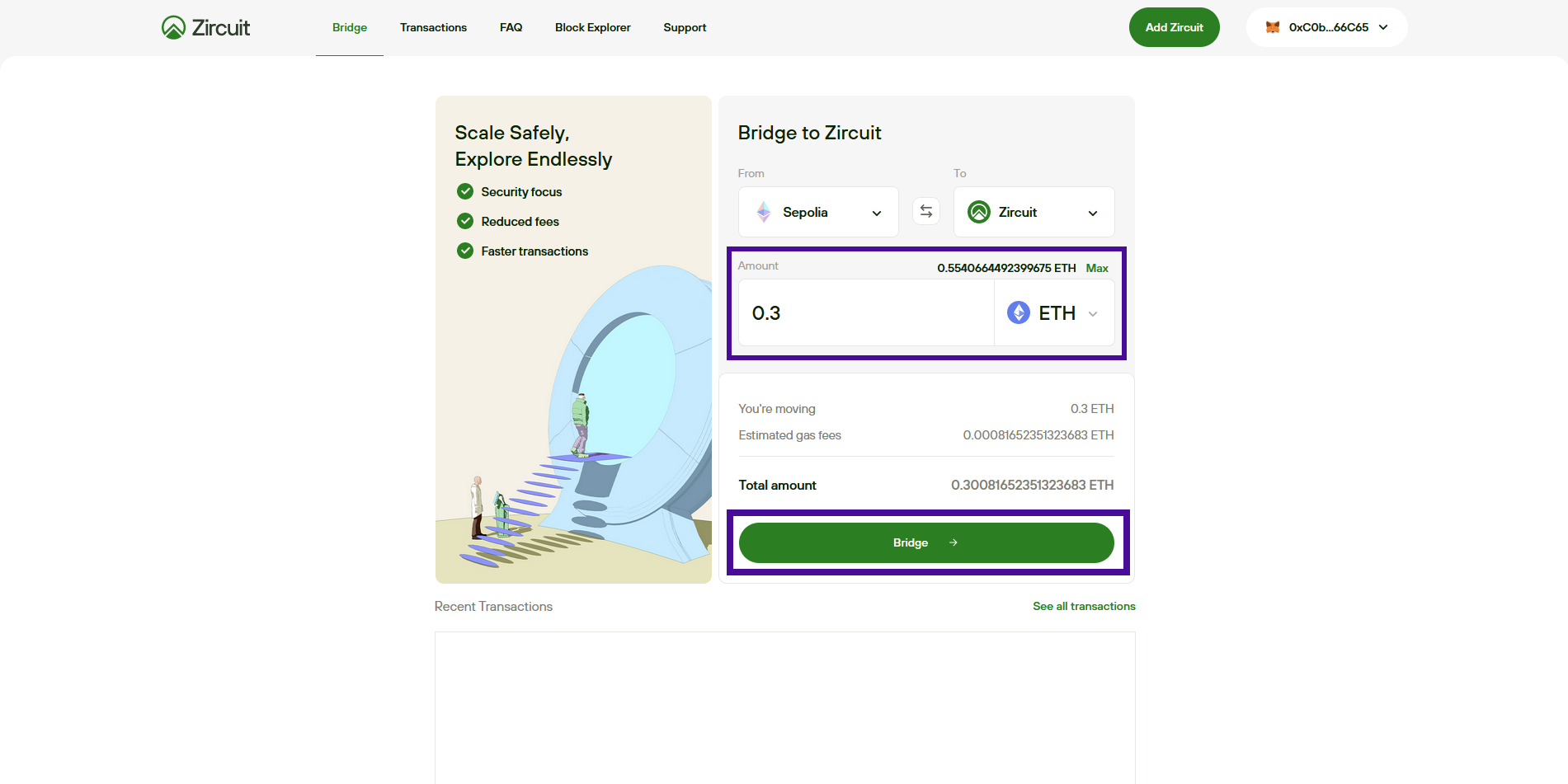 Now we're just going to insert an amount of ETH and click "Bridge".