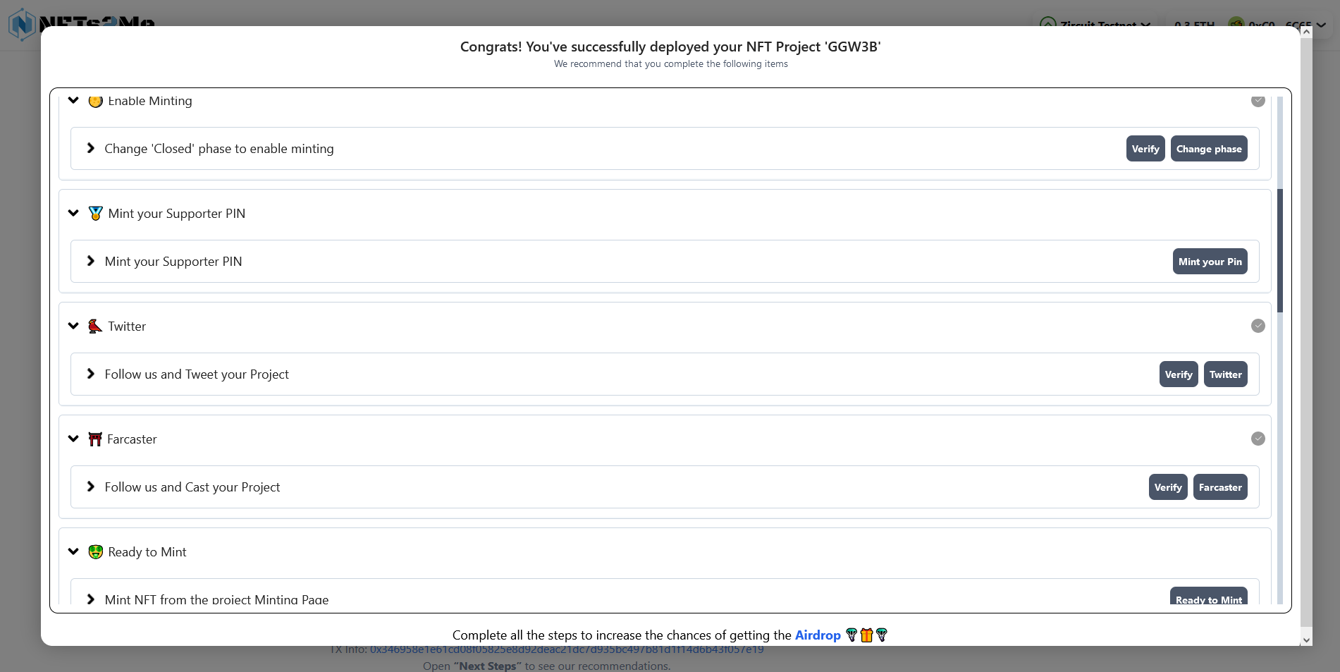 Once your NFT has been launched, we can then complete some extra steps, such as: Enable Minting, Mint the Supporter Pin (NFT), Follow the Zircuit team on X (Formely Twitter), Join the Discord server etc.