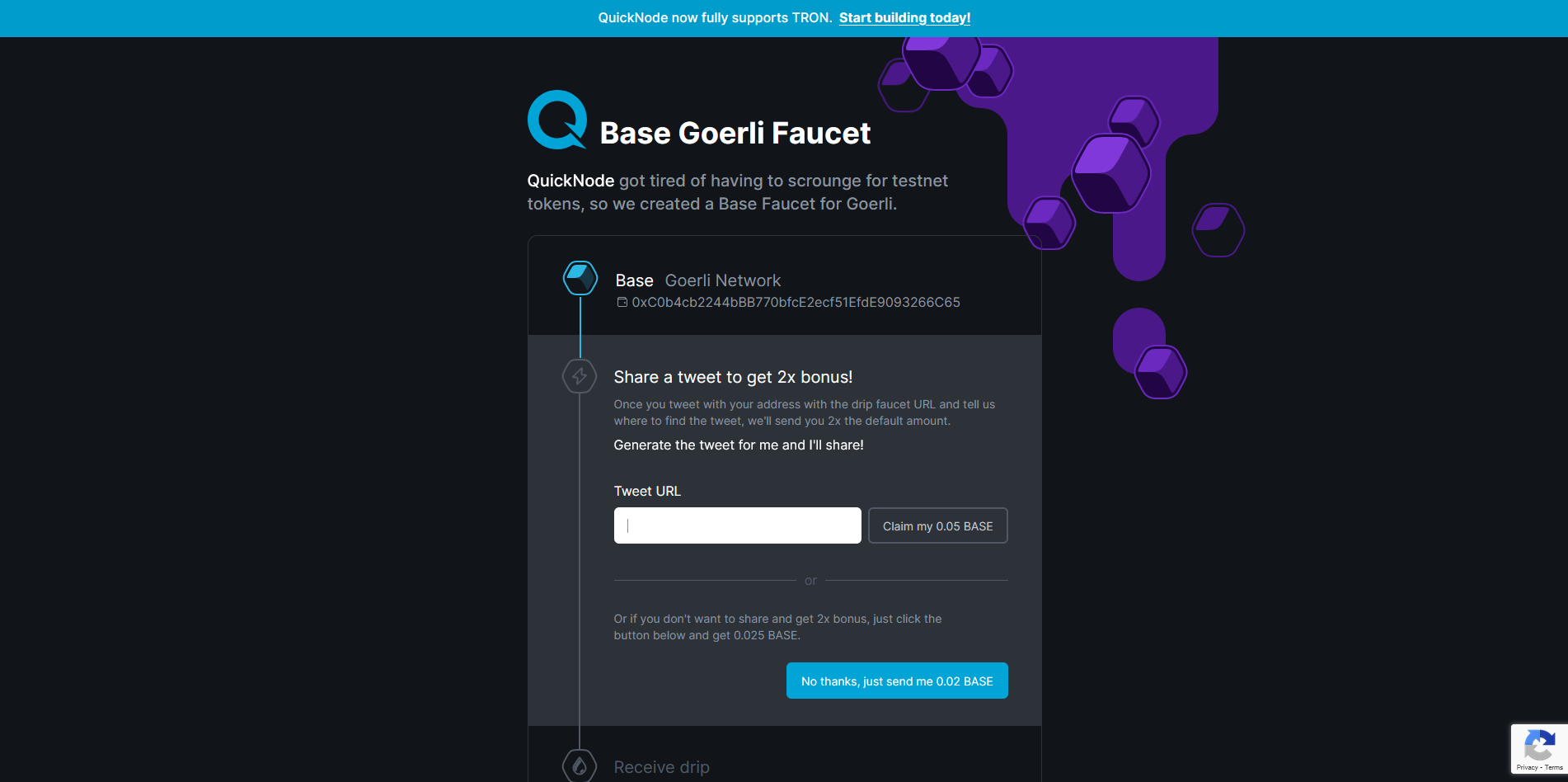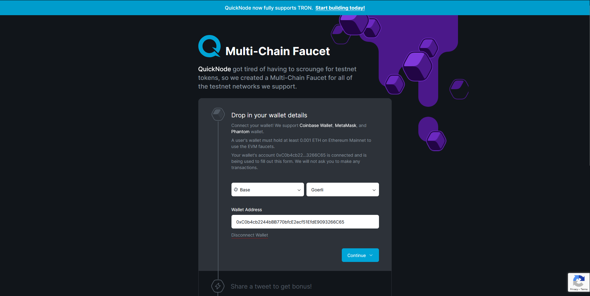 Then go to faucet.quicknode.com/base/goerli, insert your MetaMask wallet address & select "Continue".